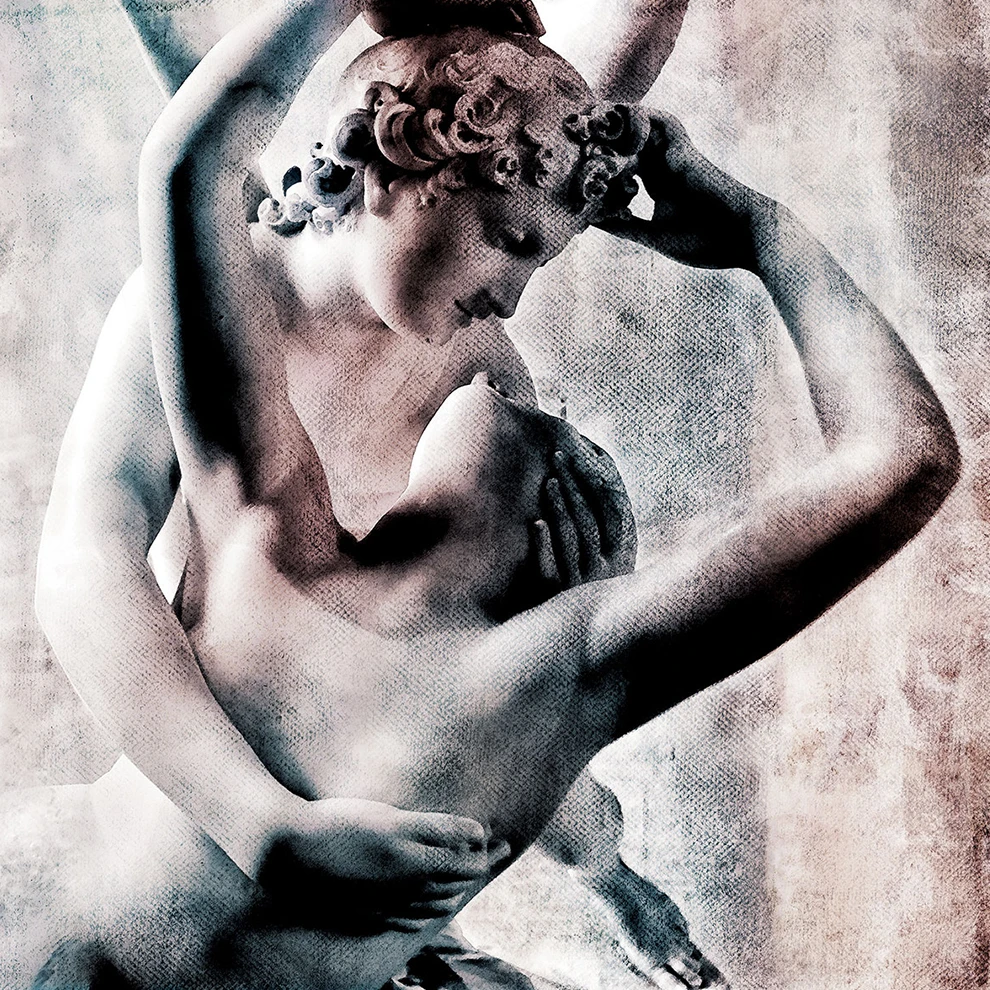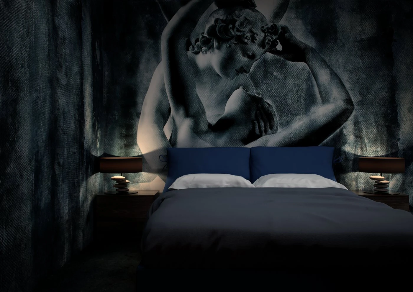Psyche in Love z kolekcji Glamora Classic Now to fototapeta na ścianę w pocałunek. Wysublimowana inspiracja sztuką klasyczną. Rzeźba przedstawiająca parę zakochanych w namiętnym uścisku. Zmysłowe i delikatne ukazanie pożądania. Do eleganckich wnętrz.