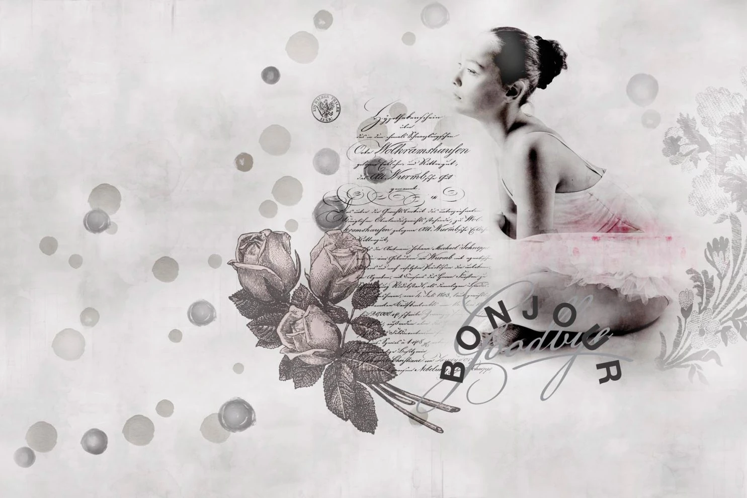 Parole z kolekcji Glamora Donna to romantyczna tapeta ścienna w baletnicę. Delikatna kolorystyka i jasne, lekko postarzane tło. Całość dopełniona napisami, jakby rękopisem z dokumentu lub prywatnego dzienniczka. Połączenie stylu vintage z nutą pop art.
