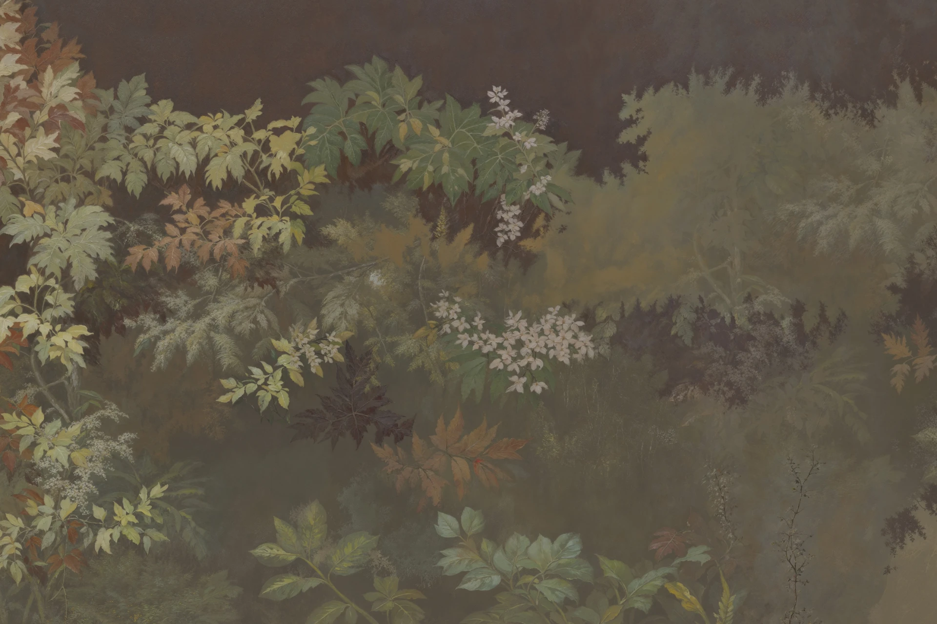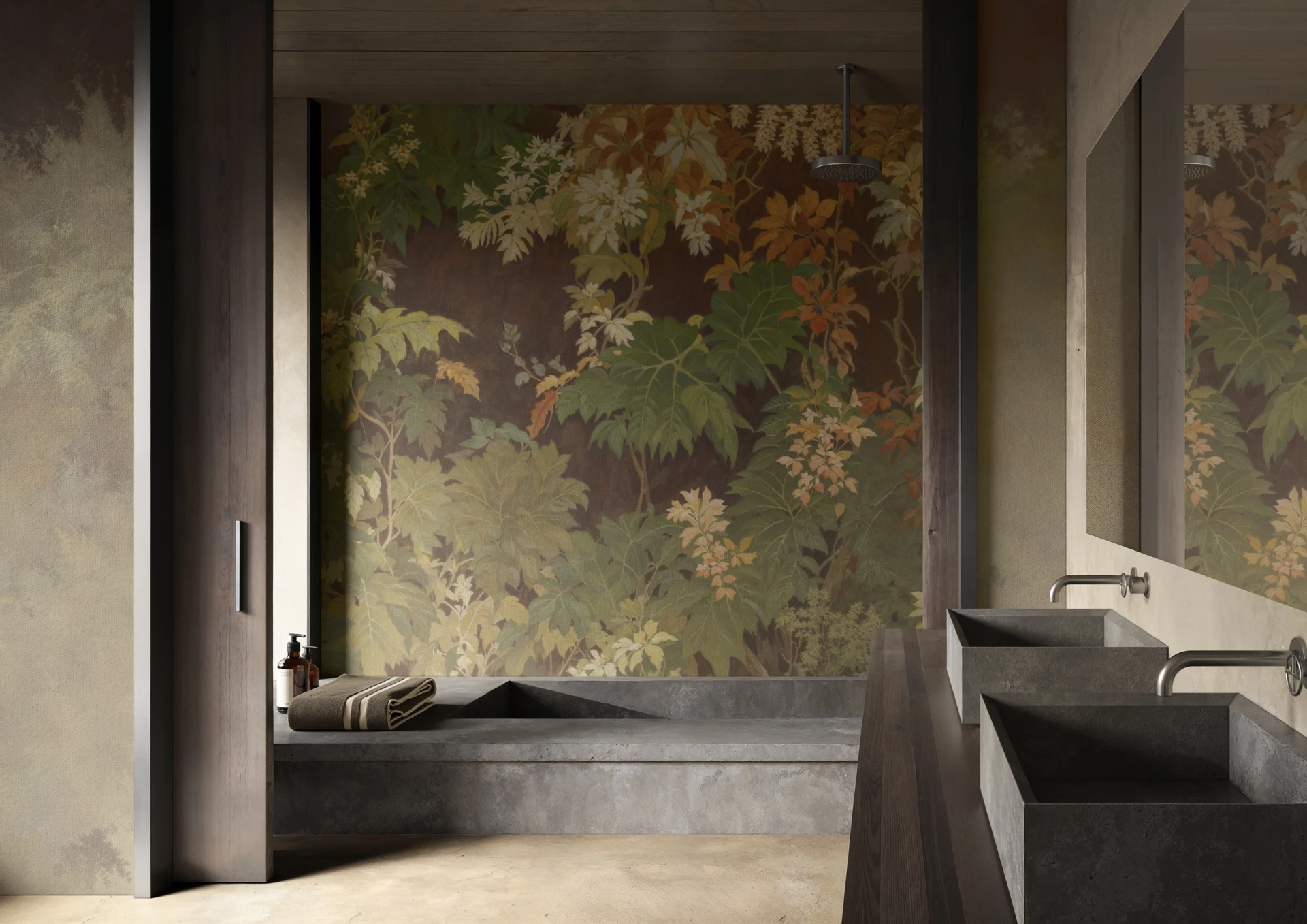 Grafika Glamora BOMARZO to bujna, sceniczna kompozycja inspirowana dziką, tajemniczą roślinnością – pnącza, paprocie i korony kwiatów wspinają się po głębokim, zaciemnionym tle niczym w ukrytym, starożytnym ogrodzie. Motyw łączy gęstą, teatralną roślinność z miękkimi przejściami światłocienia, tworząc wrażenie rytmu, głębi i subtelnej narracji przywołującej klimat legend i zapomnianych przestrzeni natury. Grafika występuje w wariantach kolorystycznych oraz w wersjach uzupełniających – abstrakcyjnych mikro-patternach i neutralnych tłach o drobnej fakturze – które umożliwiają swobodne komponowanie harmonijnych, wielkoformatowych aranżacji ściennych.