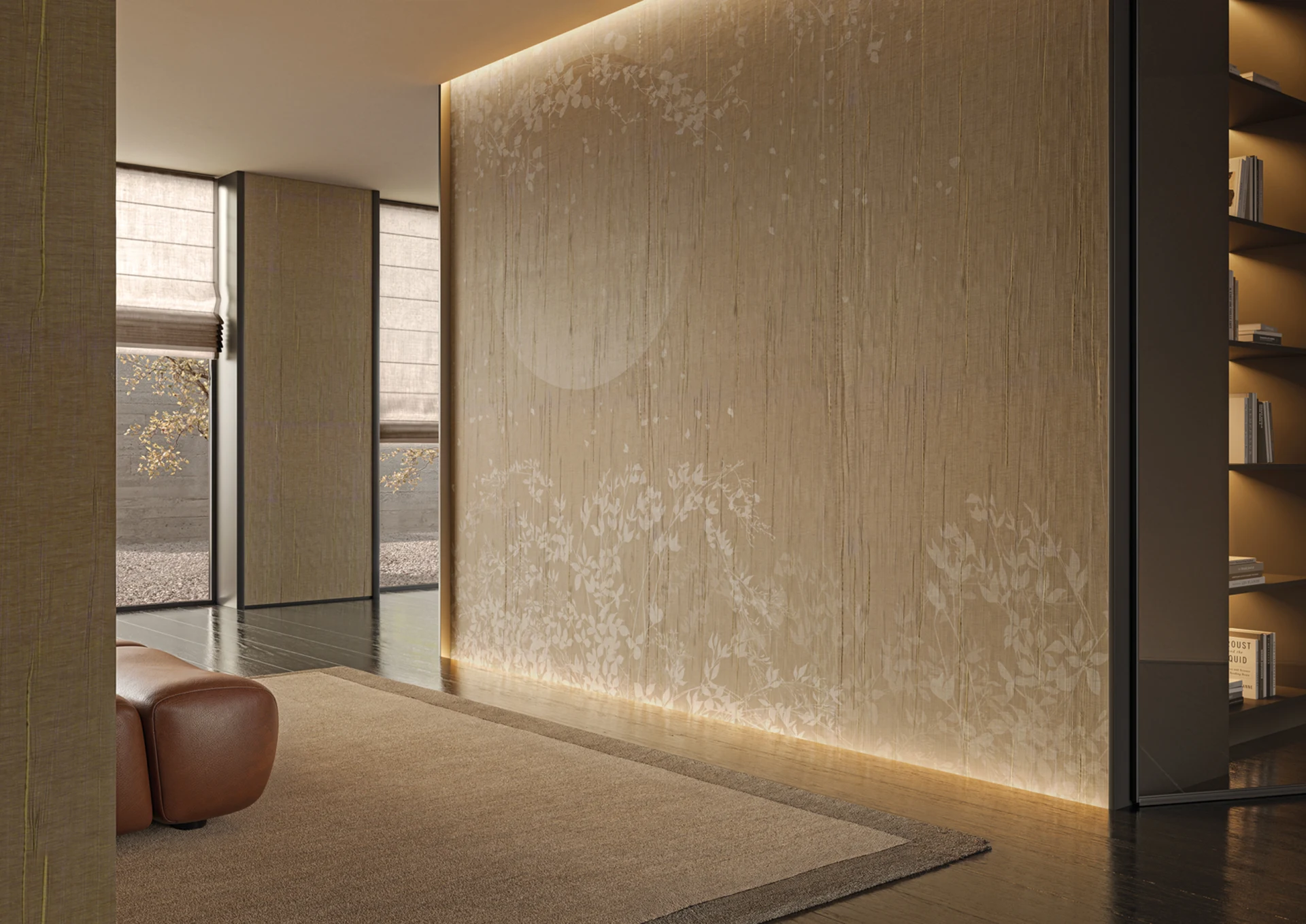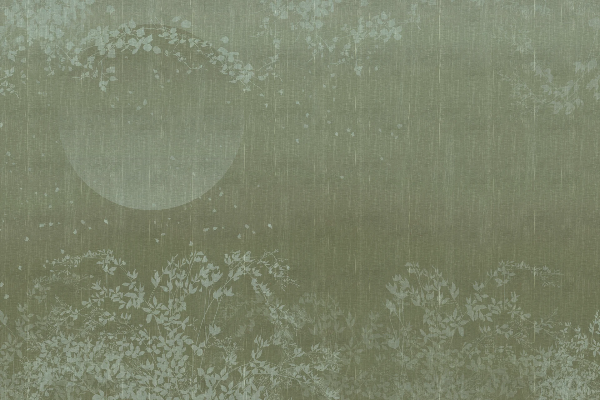 Tapeta ma jasny, miękki motyw roślinny z delikatnie zaznaczonym kołem przypominającym słońce albo księżyc. Rośliny układają się głównie przy dolnej i górnej części wzoru, dzięki czemu środek zostaje spokojniejszy i nie przytłacza wnętrza. Ciepłe beże, kremowe odcienie i subtelna faktura tkaniny sprawiają, że ściana wygląda lekko, naturalnie i przytulnie. To dobra tapeta do sypialni, salonu albo pokoju wypoczynkowego, szczególnie jeśli wnętrze ma być jasne, spokojne i bliskie naturze.