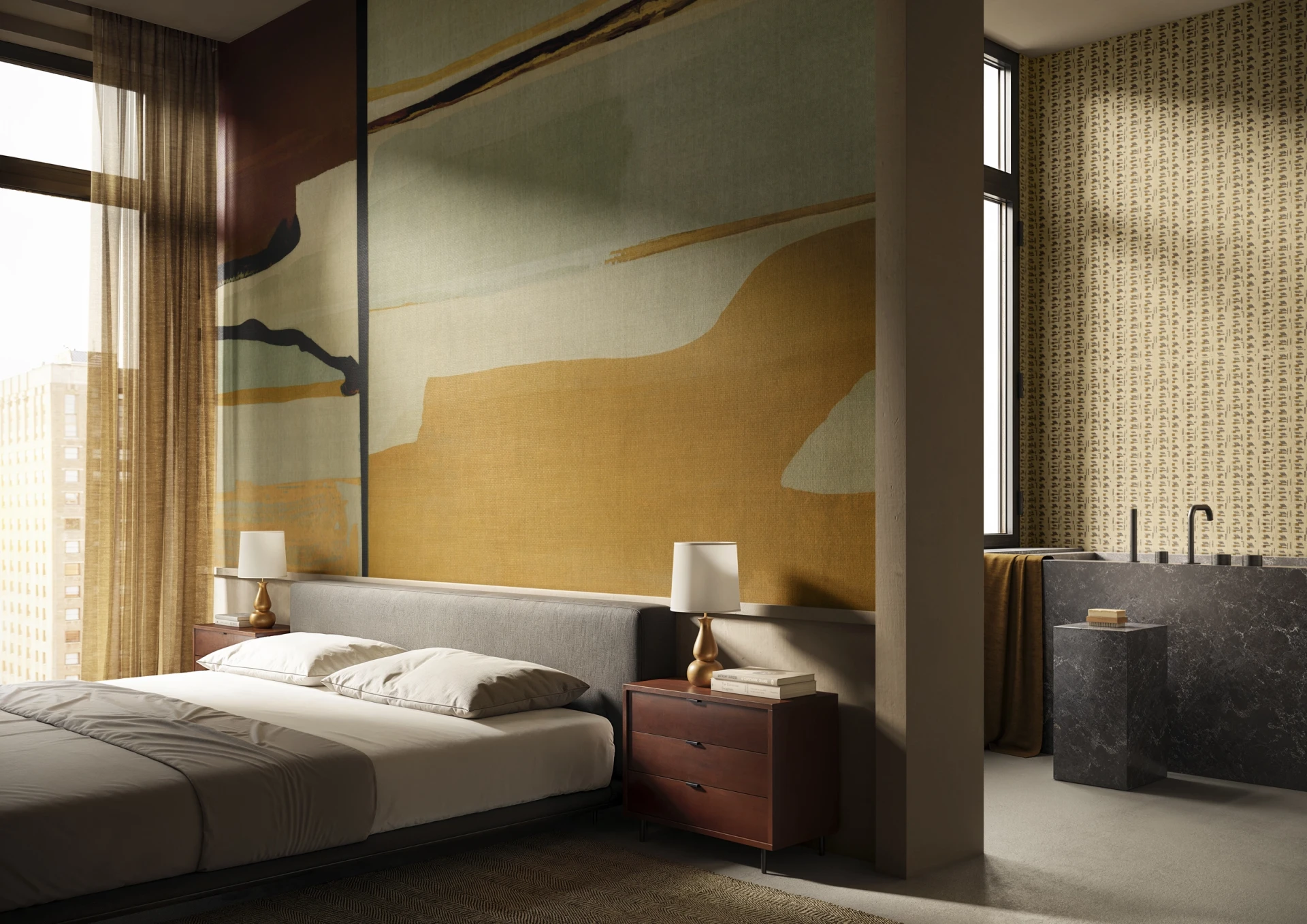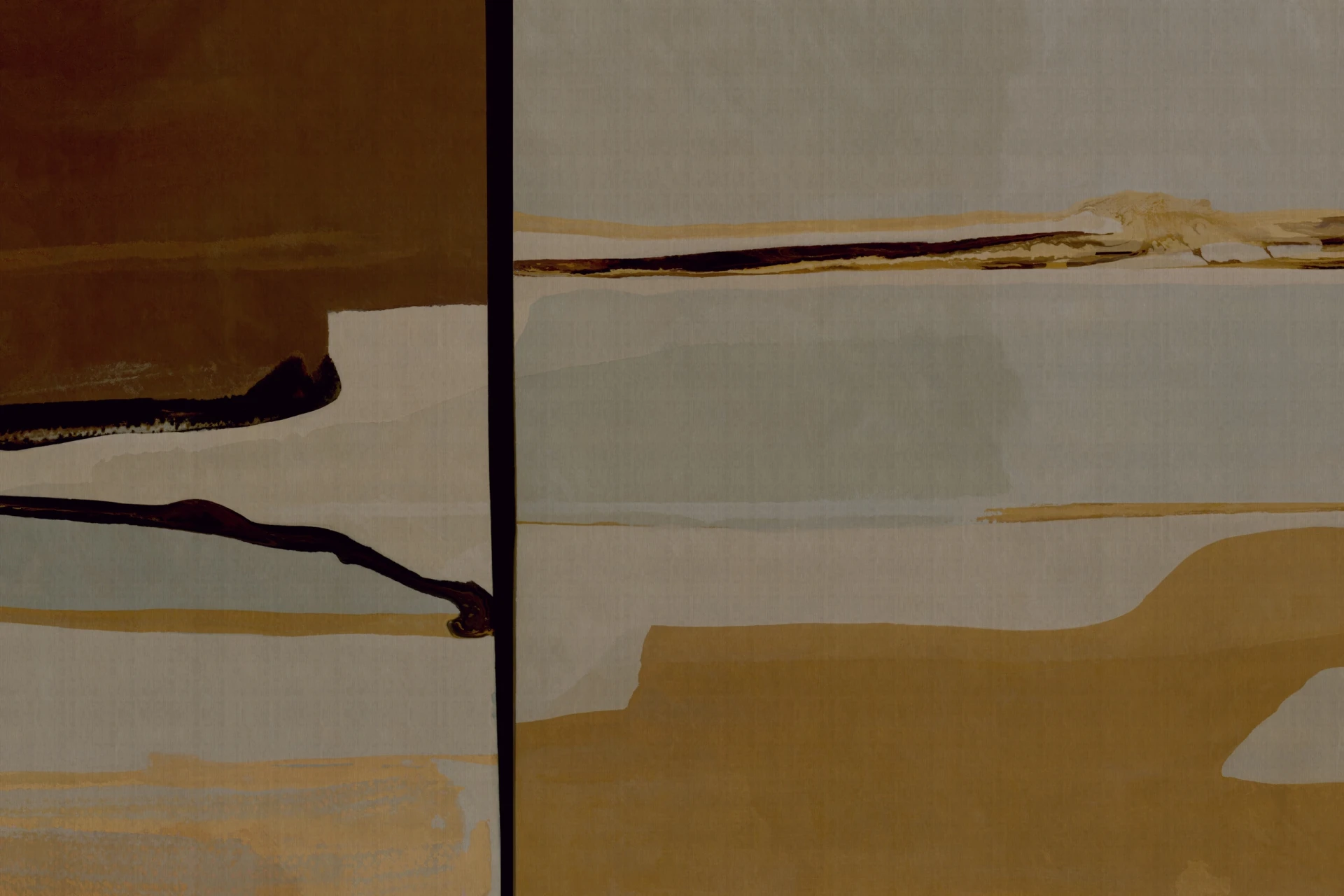 Grafika Glamora LIMO to abstrakcyjna kompozycja zbudowana z nakładających się, horyzontalnych pasm i płaszczyzn, które przypominają sedimenty lub warstwy osadów uformowane z czasem. Ostro zarysowane linie spotykają się z miękkimi, rozmytymi polami, prowadząc wzrok przez spokojną, rytmiczną mapę przypominającą geometrię geologicznych brzegów, równin i piaszczystych terenów osuszonych wiatrem. Motyw operuje subtelnymi kontrastami i przejściami tonalnymi, tworząc wrażenie głębi i cierpliwego przemieszczania się elementów, a grafika dostępna jest w wariantach kolorystycznych oraz w wersjach uzupełniających — mikro-patternach i neutralnych tłach o delikatnej fakturze — które umożliwiają komponowanie harmonijnych, wielkoformatowych aranżacji ściennych.