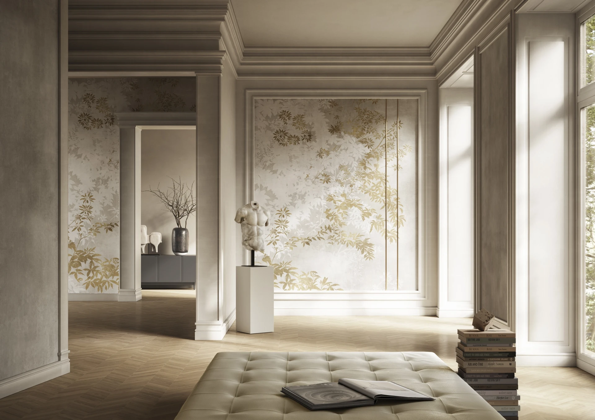 Grafika Glamora NOEMA to kompozycja, w której drobne, splecione liście i delikatne, niemal przezroczyste warstwy układają się w subtelny, arabeski rytm unoszący się nad płótnem ściany, jak gdyby natura zawieszona została w przestrzeni między światłem a ciszą. Trateggi świetlne i przerwy światła tworzą lekki, dyskretny ornament, który zachowuje pamięć o czułych, ulotnych ścieżkach roślinnych pędów. Grafika występuje w wariantach kolorystycznych oraz w wersjach uzupełniających — mikro-patternach i neutralnych tłach o subtelnej fakturze — które umożliwiają harmonijne komponowanie spójnych, wielkoformatowych aranżacji ściennych.
