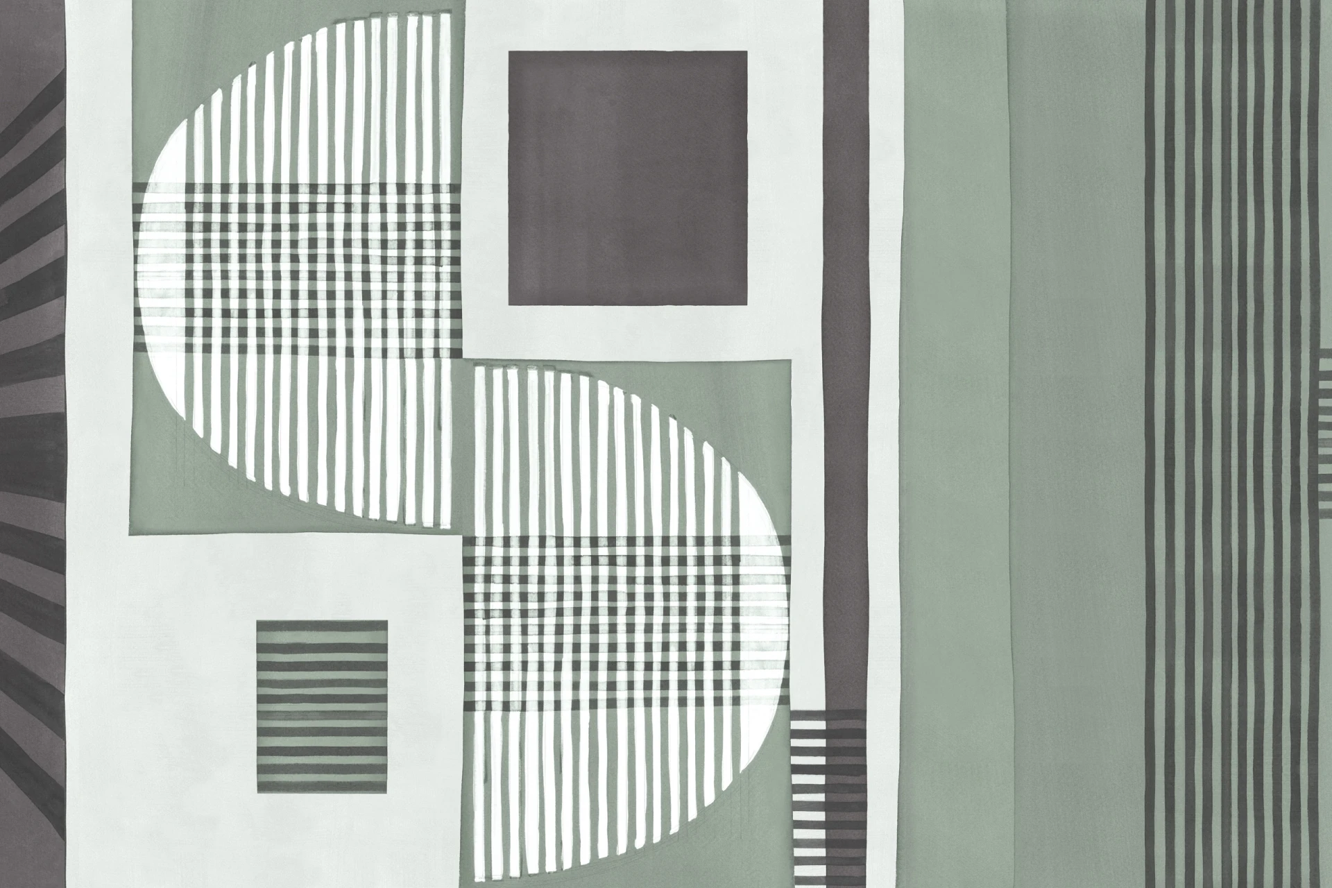 Grafika Glamora TERRACINA to abstrakcyjna kompozycja budowana wokół spotkania półokręgu przełamanego rytmicznymi liniami oraz zwartymi pasmami przecinanymi horyzontalnymi śladami, które prowadzą się jak fale dźwiękowe, rozprzestrzeniając i skupiając rytm formy. Pełne pola zestawione z liniowymi akcentami definiują intensywną, kierunkową ikonografię o zdecydowanym charakterze, w której geometria i rytm tworzą współczesny totem obecności scenicznej. Grafika występuje w wariantach kolorystycznych oraz w wersjach uzupełniających — abstrakcyjnych mikro-patternach i neutralnych tłach o subtelnej fakturze — które umożliwiają komponowanie spójnych, wielkoformatowych aranżacji ściennych.