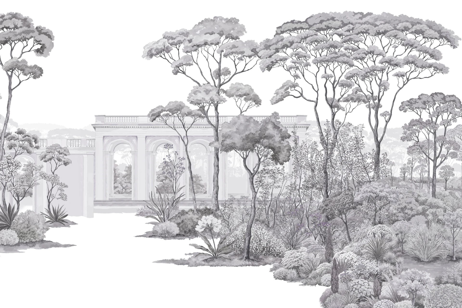 Grafika Glamora VILLA PAMPHILI to kompozycja inspirowana widokiem świetlistej fasady z arkadami i balustradami, która stanowi tło dla delikatnej roślinnej sceny z sosnami, agawami i kwitnącymi krzewami, jakby zaaranżowanymi przez niewidzialnego ogrodnika. Roślinne elementy układają się rytmicznie w przestrzeni, tworząc scenę przypominającą swobodny, miejski spacer w ogrodzie pełnym filtrującego się światła. Grafika występuje w wariantach kolorystycznych oraz w wersjach uzupełniających — mikro-patternach i neutralnych tłach o subtelnej fakturze — które umożliwiają komponowanie spójnych, wielkoformatowych aranżacji ściennych.