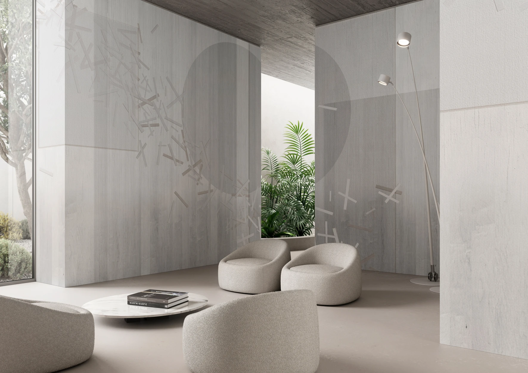 Wszystko opiera się na motywie koła i kwadratu, pozornie podzielonych, ale w rzeczywistości połączonych kaskadą tajemniczych obiektów, które szybują z góry, poruszając się po przekątnej. Zastosowanie światłocienia nadaje powierzchni trójwymiarowości, nadając rytm jej interpretacji. Temat ten swobodnie interpretuje temat kolekcji „Beyond form”, współczesną reinterpretację czystego, rygorystycznego wzoru narracji, monochromatycznych odcieni i faktury: typowej dla ruchu architektonicznego lat 50., brutalizmu.