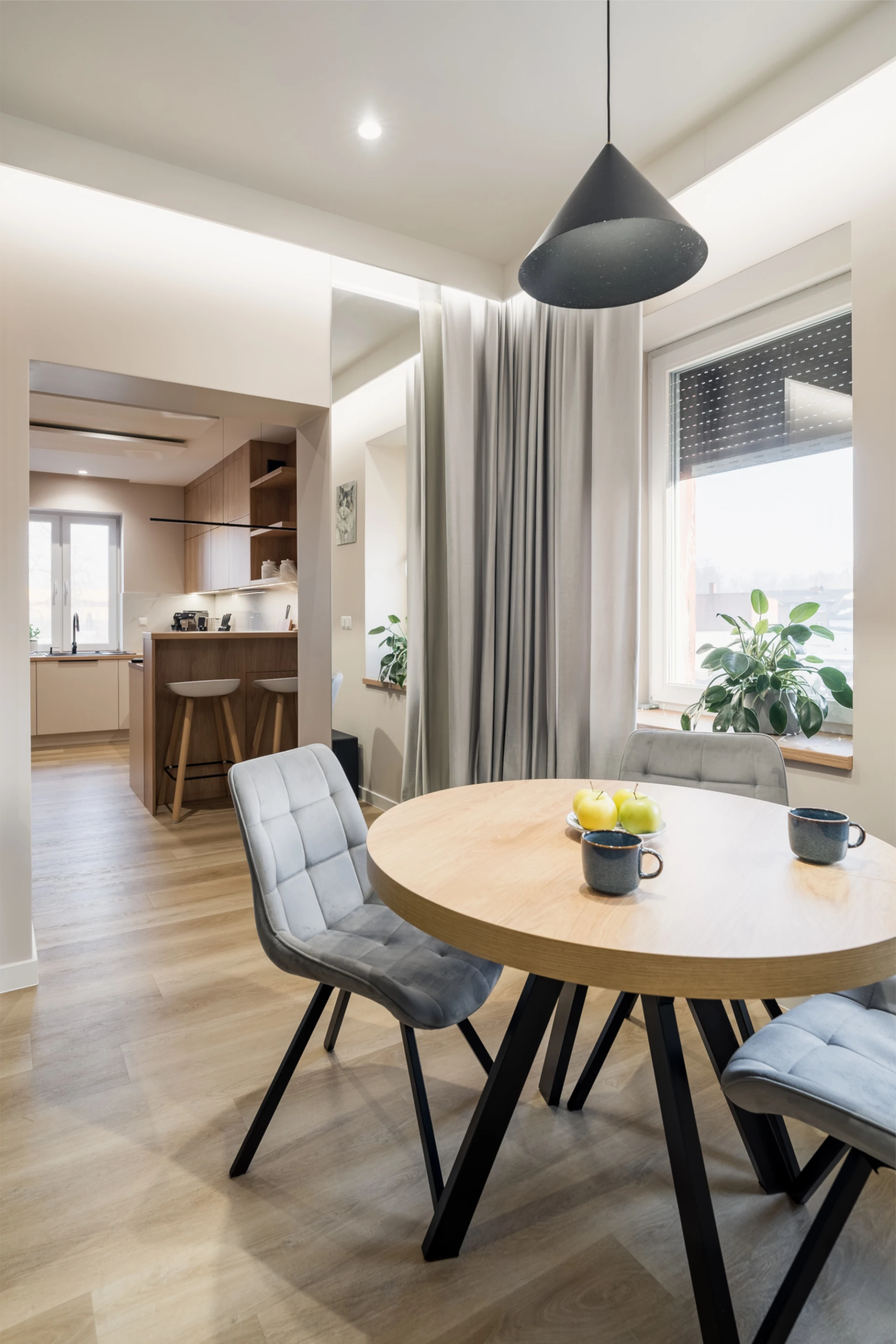 Butelkowa zieleń sofy wnosi głębię, ale nie dominuje. Okrągły stół z tapicerowanymi krzesłami zachęca, by przysiąść dłużej – na kawę, rozmowę, chwilę pracy. Nad nim prosta, czarna lampa, która rysuje wyraźny punkt w przestrzeni.