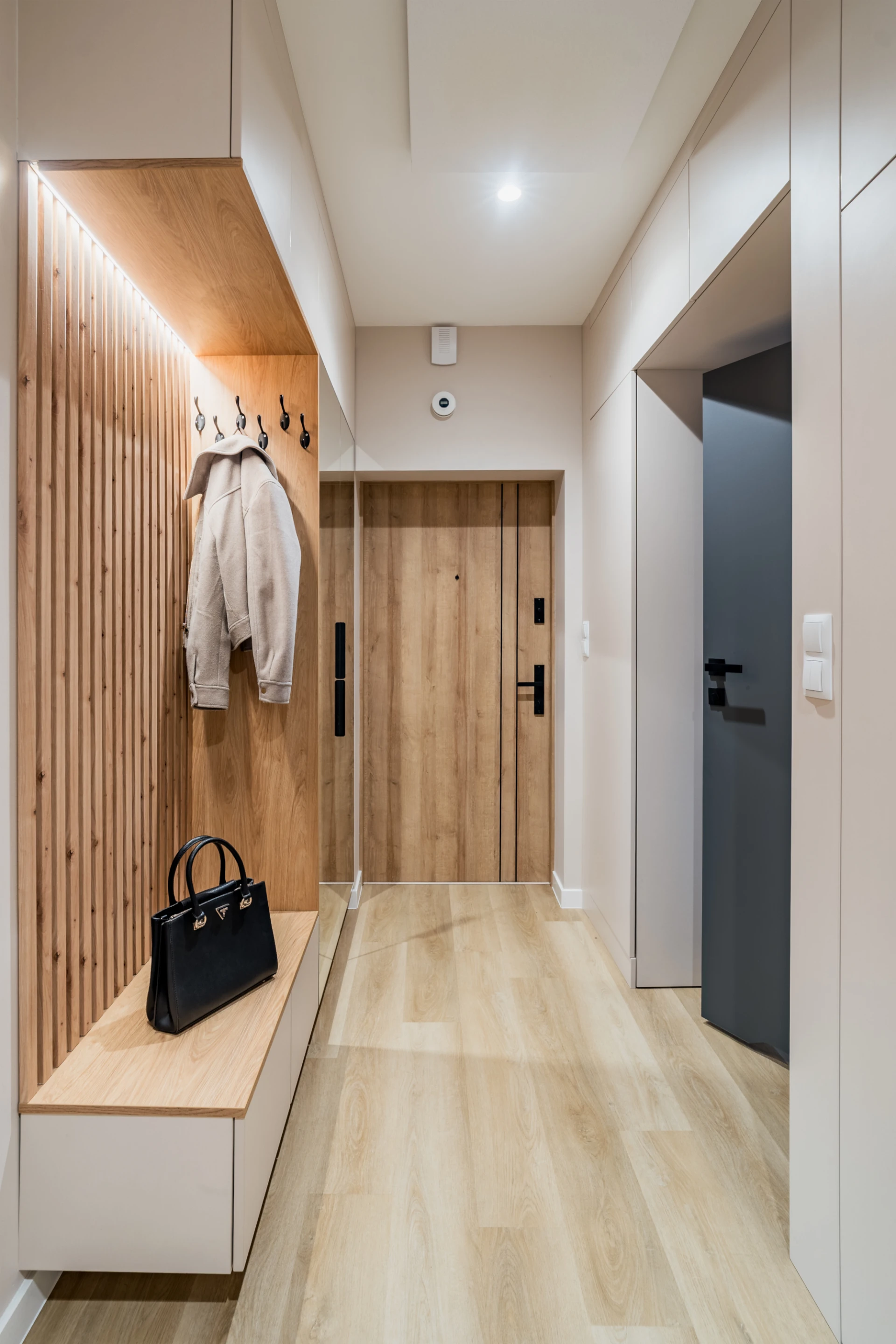 Już w strefie wejścia widać zamiłowanie do czystych form. Drewniane lamele, siedzisko i lustro tworzą funkcjonalny moduł powitalny, a pojemne zabudowy pozwalają ukryć to, co nie musi być widoczne.