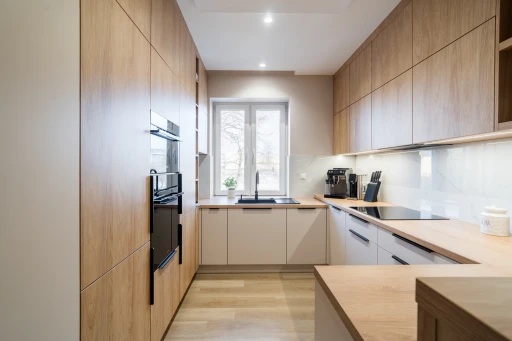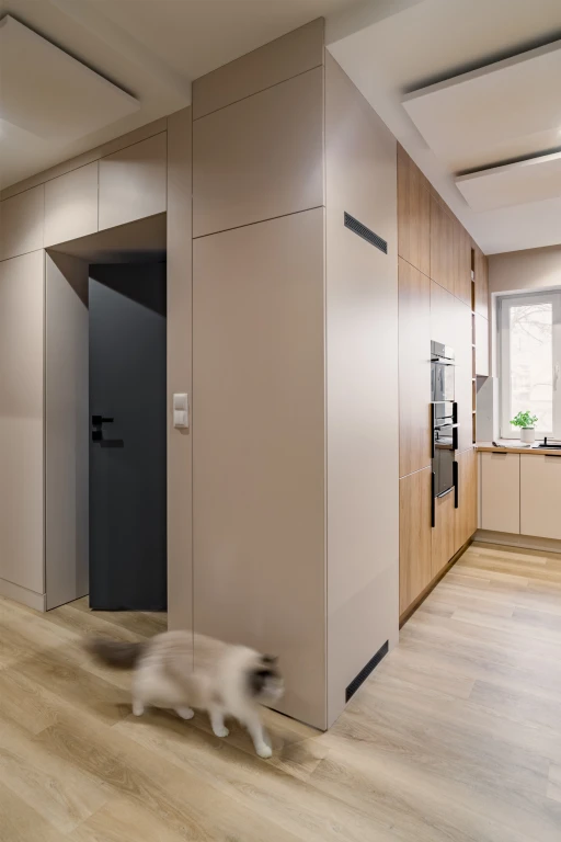 Zabudowy prowadzone są tu dwutorowo: jasne, gładkie fronty dolne oraz ciepłe, drewniane powierzchnie wysokich szaf. Kontrast jest czytelny, ale miękki.