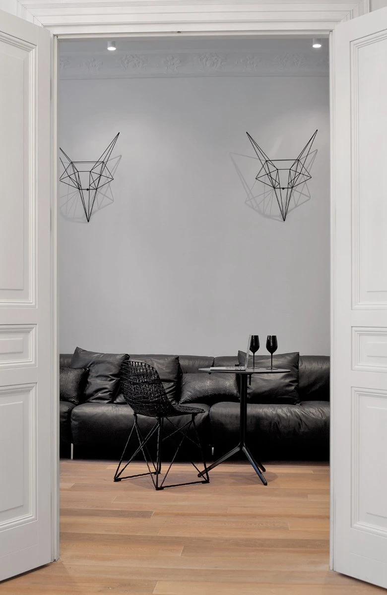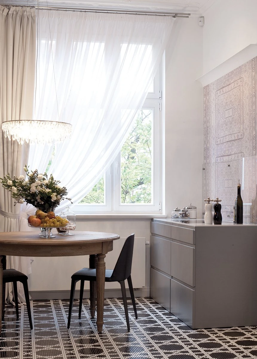 Jasno sprecyzowanym założeniem od początku było uszanowanie charakteru miejsca połączone z zamiłowaniem właścicieli do nietuzinkowych, luksusowych przedmiotów współczesnego designu. Dlatego - obok skrupulatnie odtworzonych sztukaterii, kryształowych żyrandoli, pięknej postarzanej podłogi drewnianej - pojawiło się tu na przykład jedyne (jak dotąd) w Polsce indywidualnie wykonywane i sygnowane krzesło młodego projektanta Zhanga Zhoujie, podejmujące dialog z przeszłością stylowe, ale obudowane świetlówkami lustro Lee Broom’a w sypialni czy mozaika Bisazza dająca efekt niezwykle dekoracyjnego dywanu wyznaczającego obszar kuchni i korytarzy. Także kolorystyka wnętrz została jasno określona przez właścicieli – miała być stonowana, bez silnych akcentów kolorystycznych, bazująca na czerni, bieli i szarościach. Amfiladowy układ pomieszczeń z góry narzucił podział funkcjonalny apartamentu – z hall mamy dostęp do salonu, łazienki gościnnej, kuchni oraz małej garderoby. Do salonu przylega kolejny pokój przeznaczony do przyjmowania gości. Kuchnia i salon są ze sobą połączone dodatkowym przejściem. Z kuchni przechodzimy do jadalni, a już kolejne drzwi za tym pomieszczeniem , to strefa prywatna właścicieli – obszerna garderoba i sypialnia z łazienką.