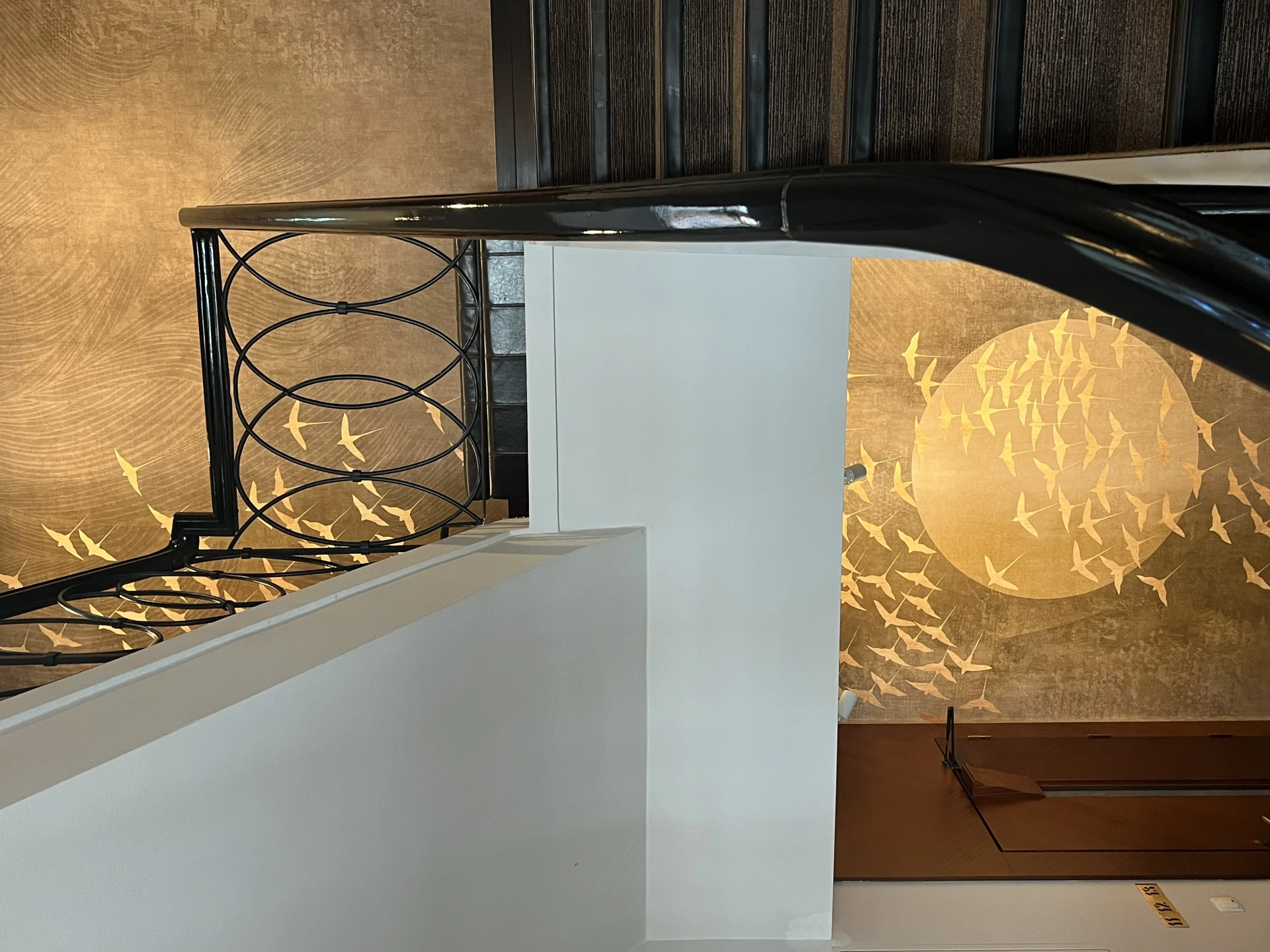 Ten motyw pojawia się również w przestrzeniach wspólnych. Na klatce schodowej uwagę przyciąga monumentalna realizacja z użyciem Glamora Aurea GLGO111. Złote, dynamiczne motywy ptaków na tle fakturowanej powierzchni tworzą efekt niemal scenograficzny. To miejsce przejścia staje się momentem zatrzymania — elementem, który gość zapamiętuje.