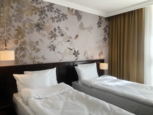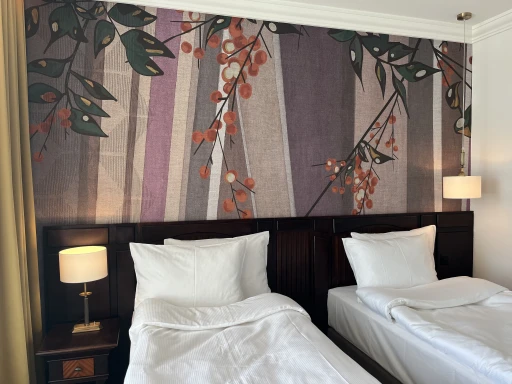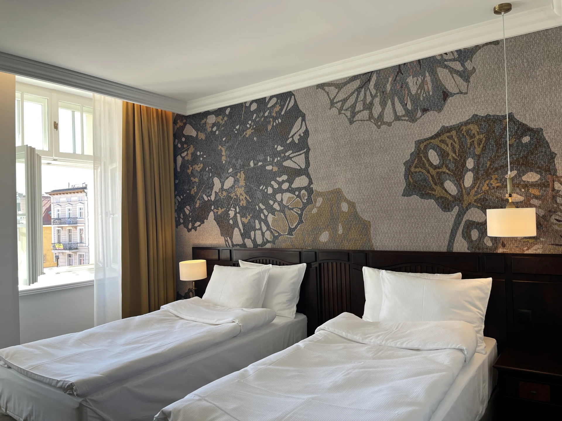 W jednym z pokoi uwagę przyciąga subtelny, roślinny rysunek tapety Arte 81535. Delikatna struktura liści, utrzymana w spokojnej, przygaszonej kolorystyce, tworzy tło, które nie dominuje wnętrza, ale je porządkuje. W połączeniu z ciemnym drewnem mebli i miękkim światłem lamp daje poczucie wyciszenia — dokładnie tego, czego oczekuje się od hotelowego pokoju w sercu miasta.