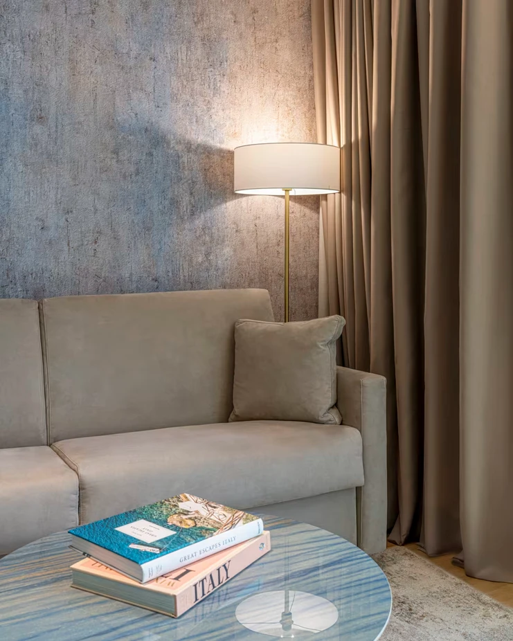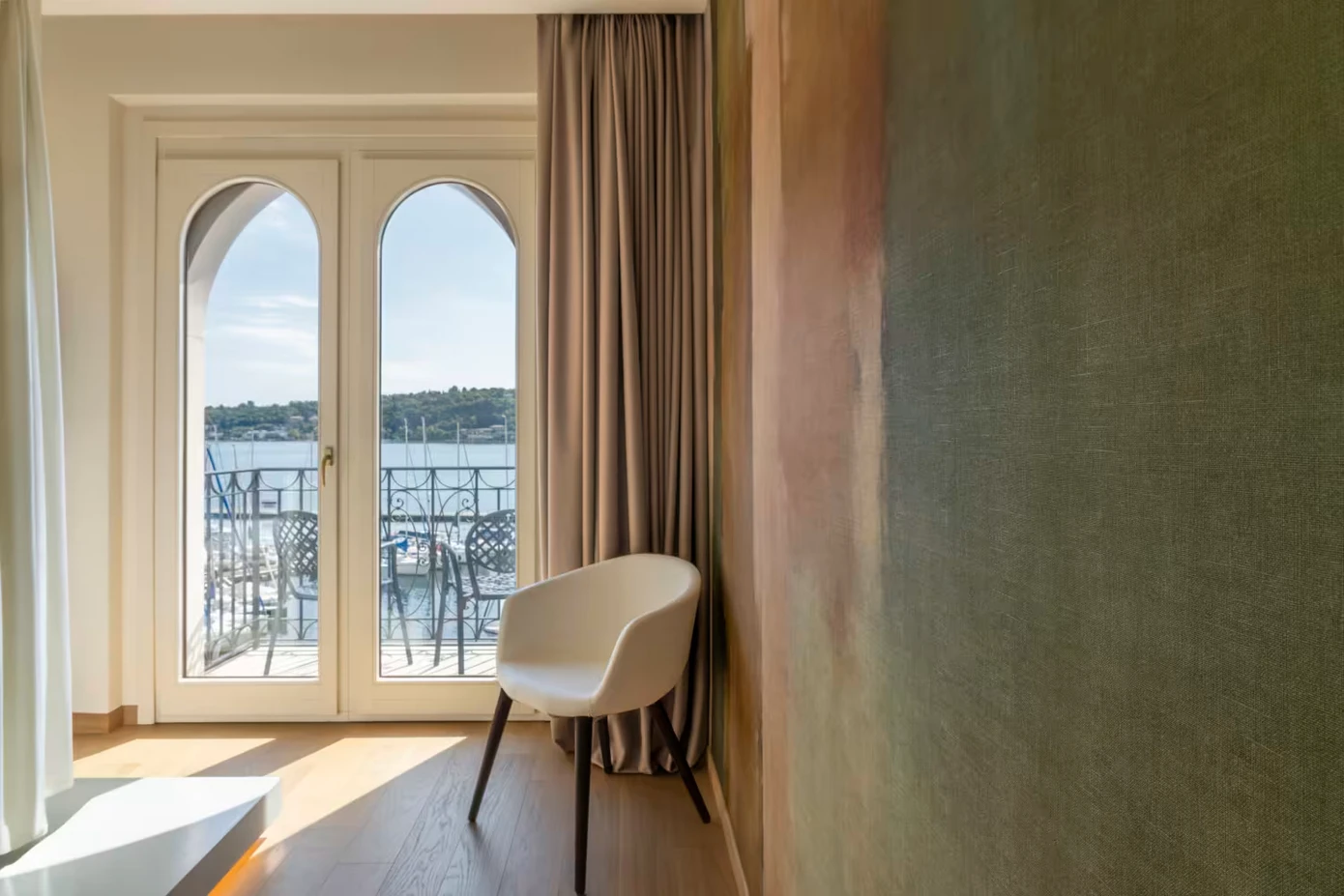 W pokojach szczególnie wyróżnia się tapeta Indigo; dzięki swoim błękitnym tonom przywodzi na myśl refleksy Jeziora Garda i towarzyszy gościom w zanurzeniu się w kojącej, jeziornej atmosferze. Paleta kolorów współgra z wyposażeniem i materiałami o miękkim, świetlistym charakterze, kształtując przestrzenie, które odzwierciedlają spokój otaczających wód.