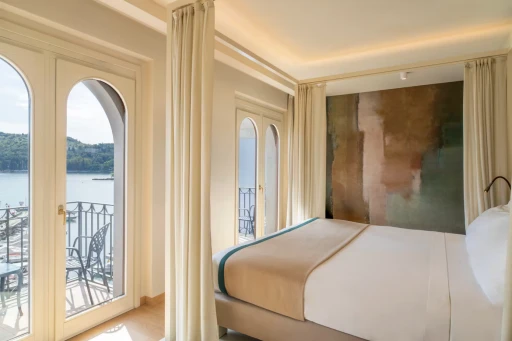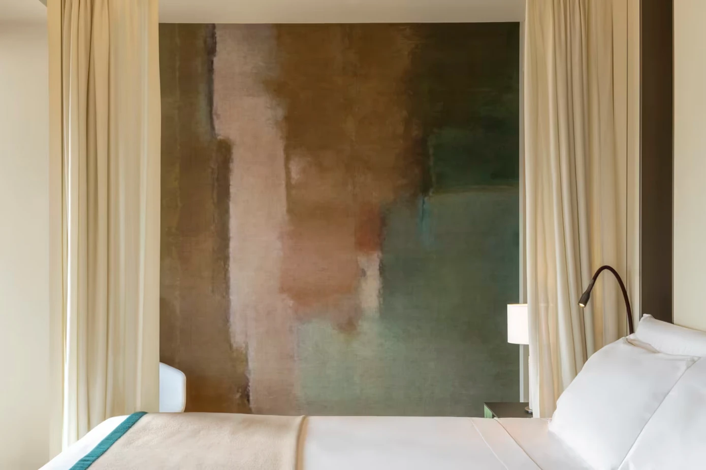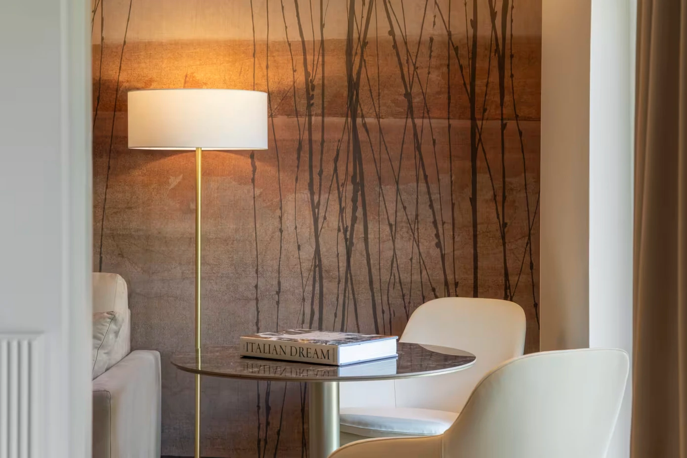 Szczególnie efektowna jest aranżacja w Suite Perla, ekskluzywnym pokoju od strony jeziora z zapierającym dech w piersiach widokiem, gdzie subtelność tapety współgra ze światłem dziennym, zamieniając pobyt w doświadczenie kontemplacji.
