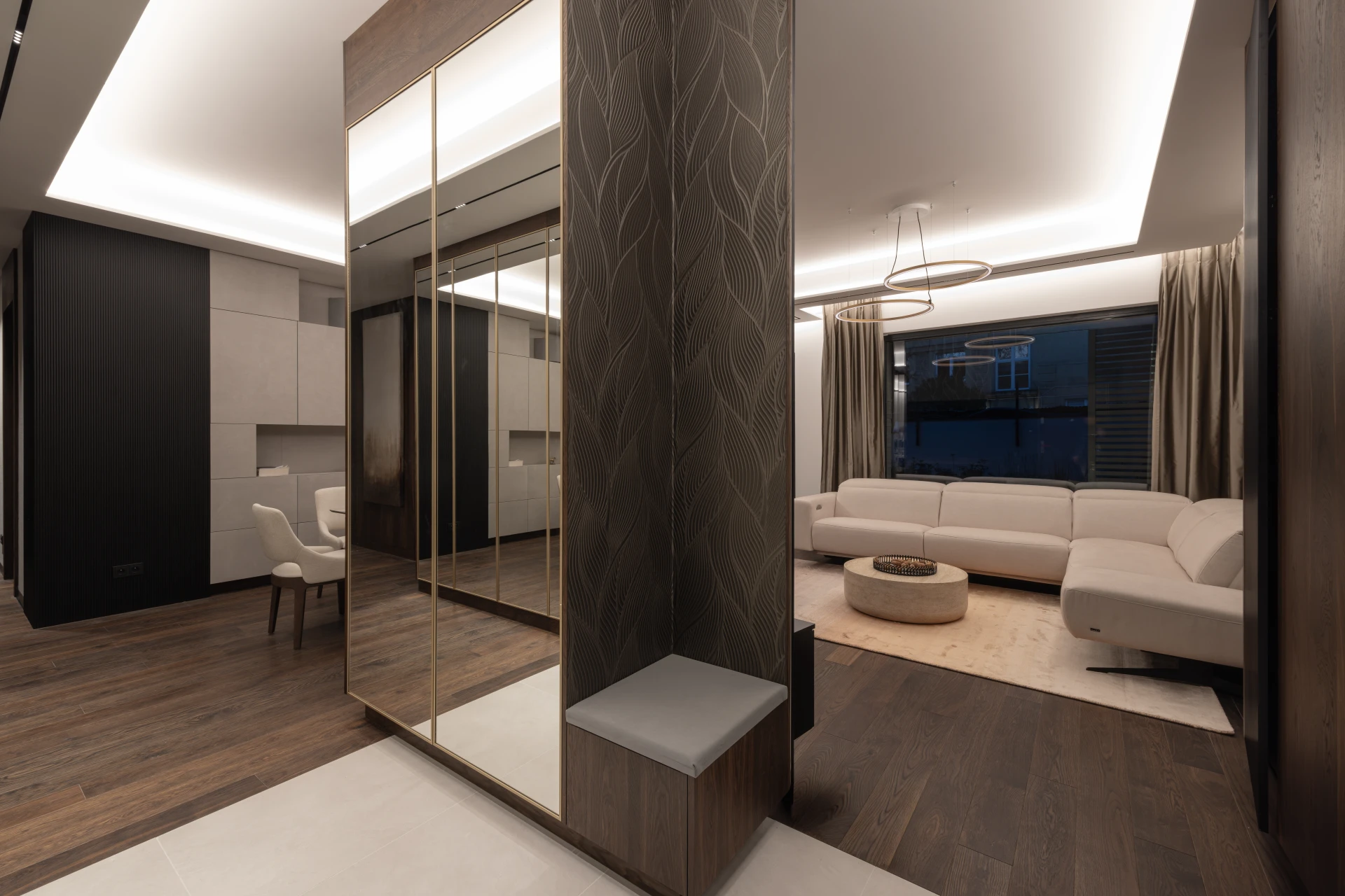 W korytarzu wzrok przyciąga biało-złota tapeta OMEXCO Khatam (również z Dekorian Home), która tworzy eleganckie tło dla lustrzanych tafli, oświetlenia liniowego i minimalistycznych drzwi. To detal, który łączy części prywatne i dzienne apartamentu w spójną całość.
