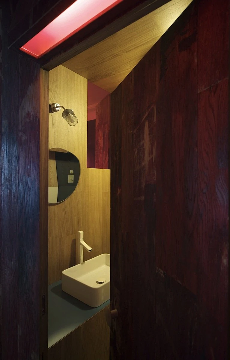 Otwarty plan mieszkania łączy centralnie usytuowany zespół kuchenno-łazienkowy obłożony drewnianymi panelami w kolorze czerwieni. Został on wykonany we Włoszech i przetransportowany do Paryża – co miało uzasadnienie praktyczne i ekonomiczne. Kuchnia została zaprojektowana tak, aby zorganizować na nowo życie mieszkańców, a sypialnia, by tworzyć nastrój intymności. Całość jest bardzo odważna i dynamiczna. Nie pozwala na obojętność.