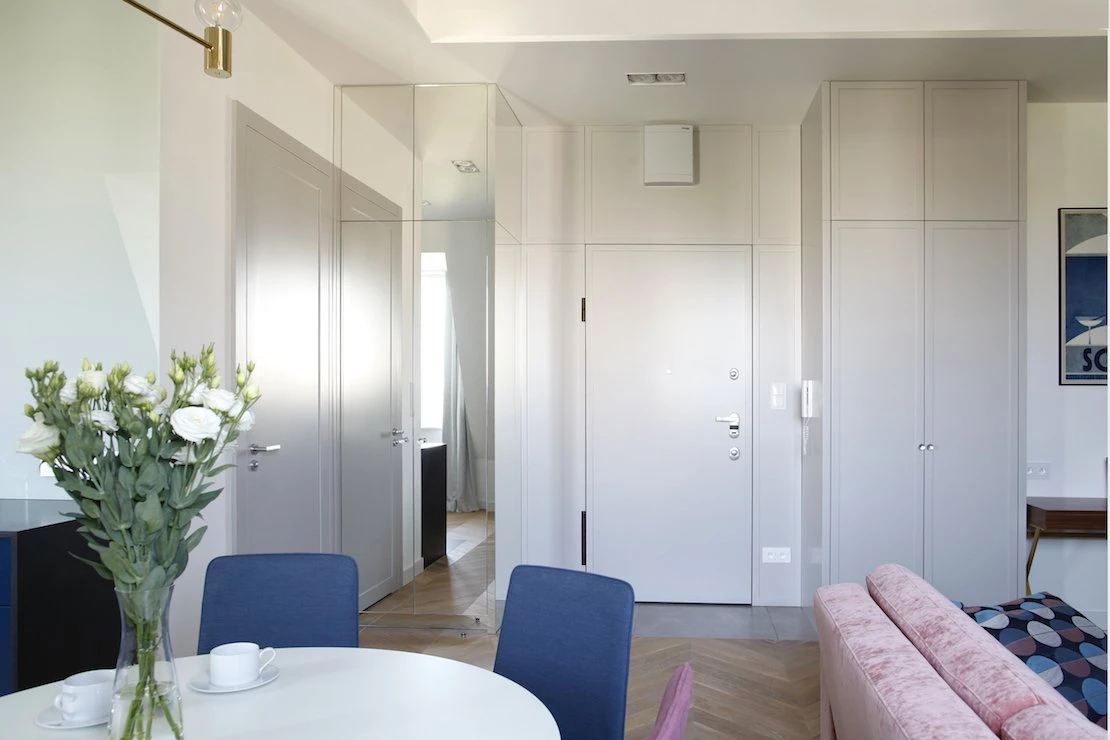 To z myślą o nich powstało 57 metrowe mieszkanie na poddaszu jednej z kamienic. Właścicielka chciała, żeby różniło się od innych lokali na wynajem, dlatego zdecydowała, żeby tradycyjny, mało funkcjonalny układ nieco unowocześnić. Poprosiła o to projektantów ze studia Sojka&Wojciechowski. Architekci dostali wolą rękę - gospodyni zależało jedynie na tym, żeby mieszkanie zyskało jak najwięcej dziennego światła, było funkcjonalne, wygodne i miało subtelny, ale wyrafinowany kobiecy charakter. To wszystko udało się osiągnąć. Architekci uzyskali jedną dużą przestrzeń, z której wydzielili przestronny salon i sypialnię oraz osobną łazienkę. Kolorystyczną bazą są ściany pomalowane farbami Para Paints na odcień neutralnej bieli. Na ich tle rysują się barwne tony, żeby tak jak życzyła sobie inwestorka, nie było nudno i sztampowo. W salonie powstała otwarta kuchnia, która jest tu niewątpliwie najmocniejszym akcentem. Robiona na zamówienie zabudowa meblowa idealnie wpasowała się pod skosy - dostała kolor intensywnego granatu. Dolne szafki zostały nakryte czarnymi blatami ze spieków kwarcowych, a fronty górnych szafek w kolorze delikatnego ecru zyskały ciekawy szczegół dekoracyjny w postaci geometrycznych frezowań. Żeby łatwiej było utrzymać porządek w kuchni, na ścianie między szafkami położono transparentne szkło. Pod połaciowym oknem stanął okrągły stół i wygodne tapicerowane krzesła - choć trudno w to uwierzyć, ale w tej niewielkiej jadalni znajdzie się miejsce nawet dla pięciu osób. Przedłużeniem części kuchennej jest strefa livingowa, z dużą sofą w kolorze buduarowego różu, niewielkim stolikiem kawowym, wygodnym fotelem i komodą na sprzęt RTV. Z salonu wydzielono też niewielki kącik do pracy - ze zgrabnym biureczkiem i fotelikiem w orzechowym fornirze. Do salonu przylega sypialnia, która została sprytnie ukryta za piękną granatową tapetą zakupioną w salonie Dekorian Home. Subtelny geometryczny wzór sprytnie przykrywa drzwi, które zostały idealnie zlicowane ze ścianą i przez to na pierwszy rzut oka stały się prawie niewidoczne. W części sypialnej stanęło duże tapicerowane łóżko z zagłówkiem i pojemna zabudowa meblowa w identycznym kolorze co kuchnia. Dopełnieniem salonu i sypialni jest piękny parkiet z delikatnie bielonego dębu ułożonego we francuską jodełką, oraz głębokie, praktyczne szafy w jasnym popielatym kolorze, który pięknie komponuje się z różem i granatem. Żeby optycznie powiększyć przestrzeń salonu w niektórych szafach architekci zastosowali fronty z luster. Nieco inny charakter ma łazienka - zaprojektowana bardziej “po męsku”, w bieli i czerni. Kobiecym akcentem jest w niej posadzka z ceramicznych płytek w finezyjne desenie. Chociaż nie zmieściło się w niej miejsce na wannę (za to jest wygodna część prysznicowa), wszystkie inne sprzęty i łazienkowe akcesoria zostały schowane w specjalnie robionych na wymiar, niewidocznych szafach.