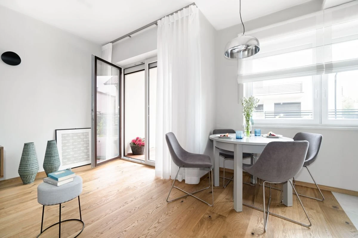 Dwukondygnacyjny apartament o powierzchni ponad 100 metrów kwadratowych mieści się w wielorodzinnym budynku w prestiżowej, usytuowanej u podnóża ruin średniowiecznego zamku, willowej dzielnicy Tarnowa. Na parterze domu znajduje się strefa dzienna: salon połączony z jadalnią i otwartą kuchnią oraz toaleta. Otwarta klatka schodowa wiedzie na piętro, na którym, po wyburzeniu niektórych ścian, wygospodarowano część prywatną - sypialnię, garderobę i gabinet oraz gościnną, ze wspólną dla nich obu łazienką.