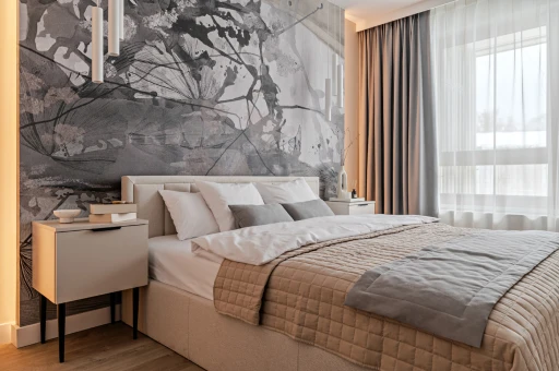 Aranżacja utrzymana jest w stylistyce nowoczesnej z dyskretnymi odniesieniami do klasyki. Proste bryły mebli ruchomych zestawiono z formami o miękkich liniach, co wprowadza zróżnicowanie bez nadmiernej ekspresji. W sypialni za łóżkiem zastosowano przedściankę eksponującą abstrakcyjną tapetę, która stanowi wyrazisty akcent w stonowanym otoczeniu.
