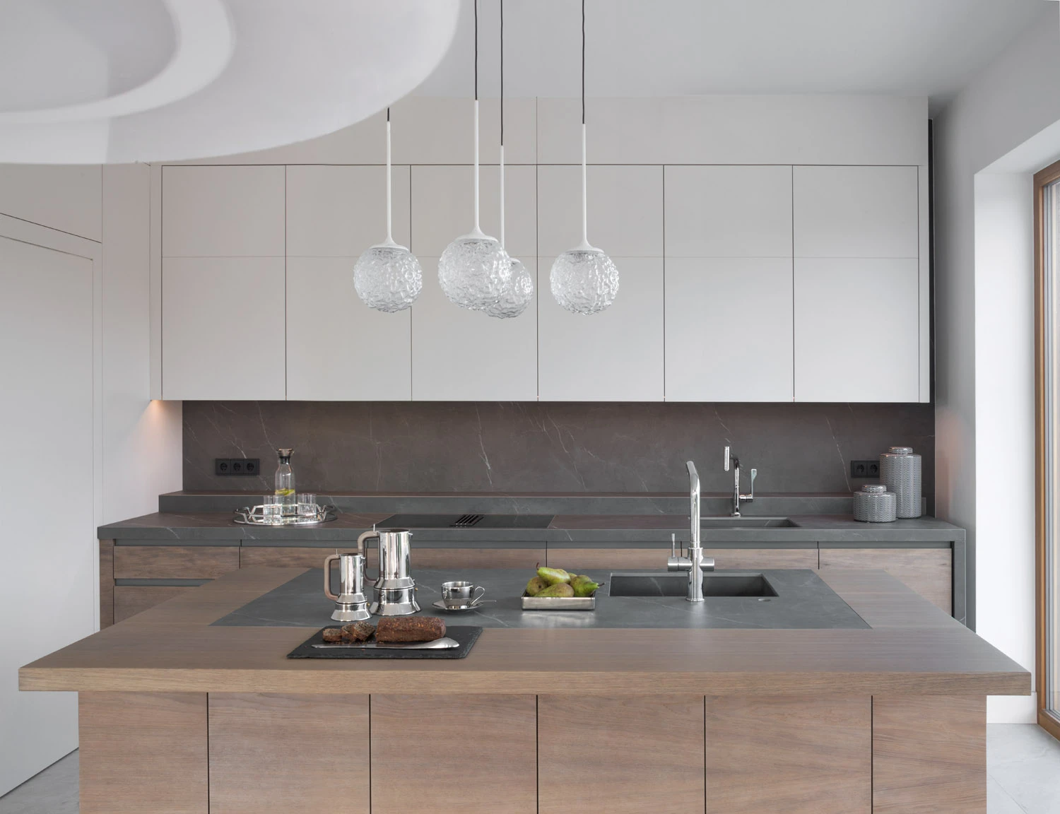 Kuchnia z jadalnią zostały zaprojektowane tak, by stylistycznie tworzyły z salonem całość. Lakierowane, jasne fronty szafek kuchennych wizualnie odciążają zabudowę, a fronty dębowe nawiązują do wykończenia drewna w salonie. Praktyczny i minimalistyczny design uzupełnia blat ze spieku kwarcowego (Laminam) otoczonego drewnem i delikatne, eleganckie lampy ze szklanymi kloszami. W kuchni zastosowano nowoczesne rozwiązania, takie jak wentylacja z dolnym odciągiem zintegrowanym z blatem, czy bateria kuchenna podająca gotowy do zaparzenia herbaty wrzątek. Drzwi ukryte w bocznej części aneksu prowadzą do drugiej, tzw. „brudnej” kuchni, zaprojektowanej w wykończeniu z odpornej stali nierdzewnej. W otwartej przestrzeni domu dominują dwa elementy, dopasowane do niej swoją skalą. Pierwszy to niebotycznie wysoki kamienny kominek, drugi – umieszczona na przeciwległej ścianie olbrzymia biblioteka.