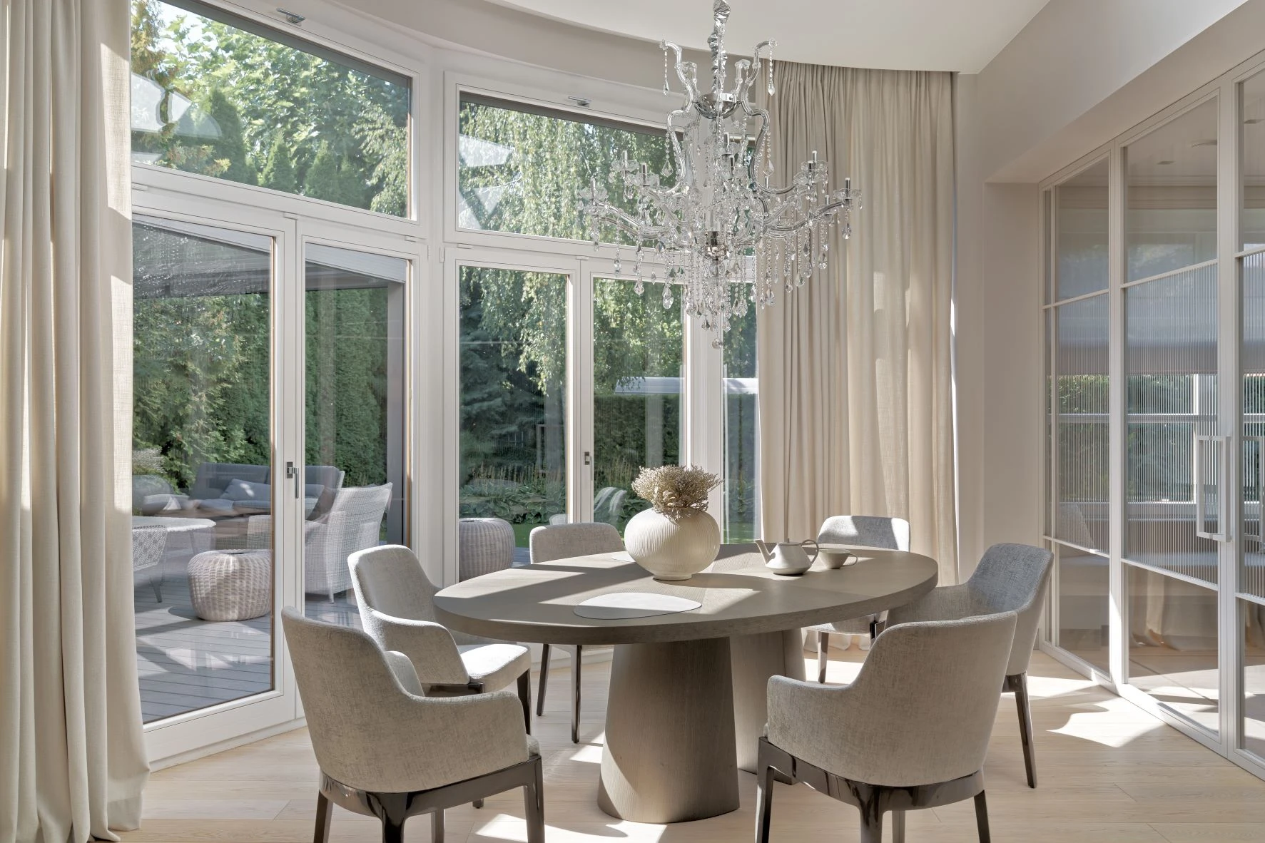 W sąsiedztwie kuchni, za kolejnymi przeszklonymi drzwiami zaprojektowano jadalnię. Jej kształt definiuje półokrągła ściana okien wychodzących na taras i ogród. Największą ozdobą jadalni jest kryształowy żyrandol Maria Teresa. Słońce padające zza okien rzuca wokół tęczowe zajączki. Kształt stołu dostosowano do kształtu przeszklonego wykusza. Wokół stołu krąg tworzą tapicerowane krzesła włoskiej marki Molteni, model Chelsea. Salon to miejsce relaksu dla całej rodziny. Trudno wyobrazić sobie bardziej sprzyjające warunki do odpoczynku. Centralny punkt salonu (i parteru) stanowi filar obłożony fornirem, w którym zamontowano gazowy kominek w ramie z naturalnego kamienia pochodzenia wulkanicznego - bazaltiny. Siedząc na narożnej sofie marki Minotti możemy obserwować ogień lub telewizor powieszony na przeciwległej ścianie. Całości strefy wypoczynkowej dopełniają czarne stoliki Galotti Radice oraz szklana konsola KK Selection. Wnętrze oświetlają bardzo dekoracyjne kinkiety brytyjskiej rzemieślniczej firmy Porta Romana. Tej samej marki jest także duża biała lampa z kamienną podstawą, którą umieszczono na konsoli za sofą. Miejsce rodzinnego relaksu ociepla beżowy dywan.
