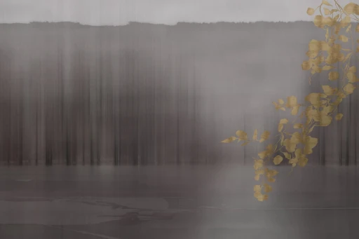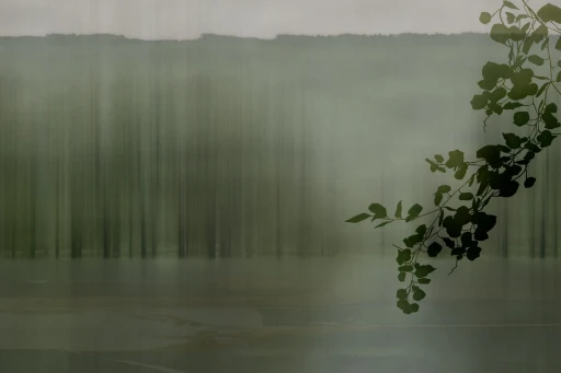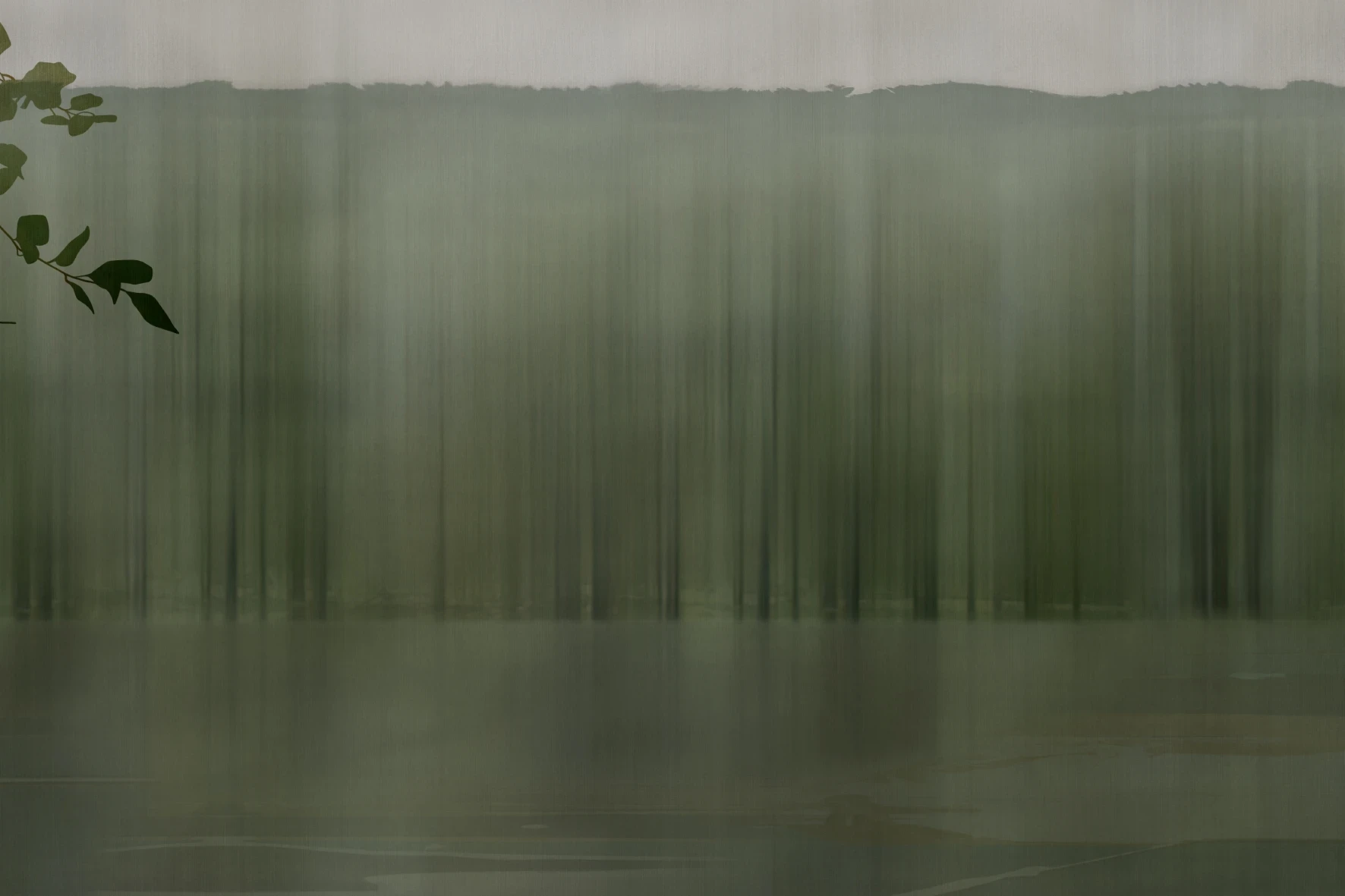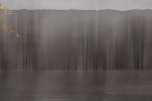 Tło tej grafiki zostało zbudowane z pionowych, miękko przenikających się smug, które mogą przywodzić na myśl odbicia drzew w wodzie, mgłę unoszącą się nad rzeką albo pejzaż oglądany przez zasłonę wilgoci i światła. Nie ma tu dosłowności. Obraz działa raczej nastrojem niż literalnym przedstawieniem.