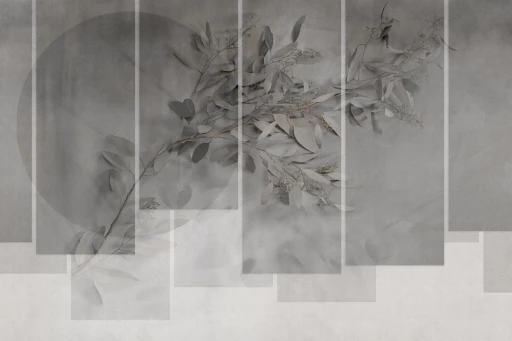 Charakterystycznym elementem „Bagliori e Ombre” są pionowe, półtransparentne pasy, które porządkują kompozycję. Ten geometryczny podział działa jak filtr światła – dzieli ścianę na strefy, w których botaniczny motyw raz jest wyraźniejszy, raz niemal zanika.