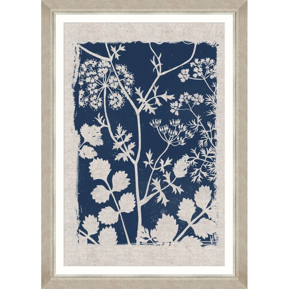 Linocut Florals od MINDTHEGAP to obraz z kwiatami na lnie drukowanym. Zjawiskowe piękno świata przyrody zamknięte w subtelnych kolorach granatu i bieli. Pejzaż zimowej przyrody na tle rozgwieżdżonego nieba. Propozycja, która zachwyca oszczędną formą i prostotą.