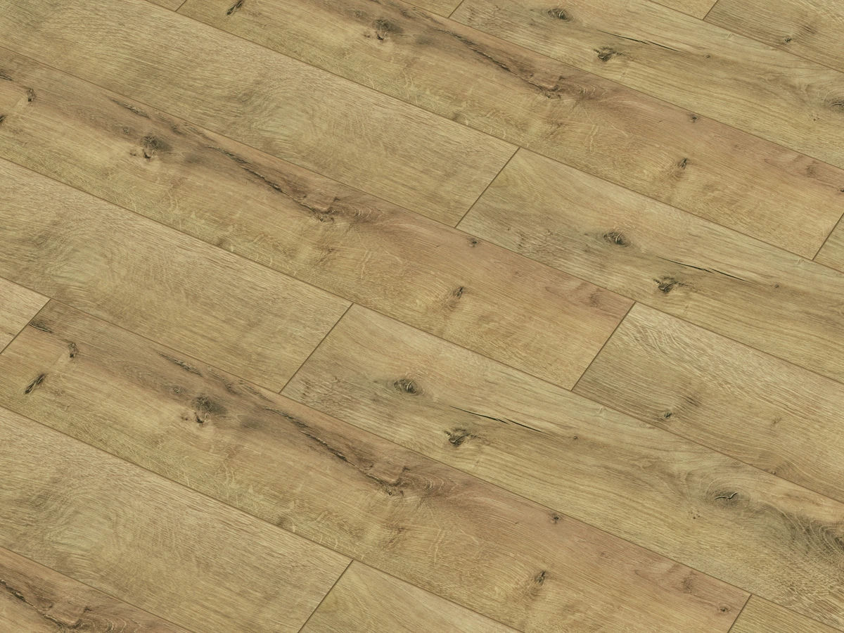 Struktura powierzchni drewna wiernie odwzorowuje naturalne usłojenie, nadając wnętrzu ciepły i autentyczny charakter. V-fuga dodatkowo podkreśla każdą deskę, tworząc efekt prawdziwej drewnianej podłogi, co wzbogaca estetykę pomieszczenia.