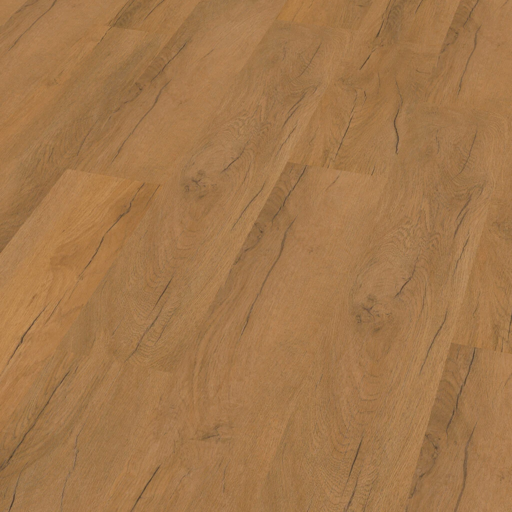 Podłoga winylowa Eastwood Alpine Oak Sweet imitująca dąb jest doskonałą alternatywą dla tradycyjnych drewnianych podłóg, łączącą w sobie estetykę naturalnego drewna z funkcjonalnością i trwałością winylu. Jej głęboki, złotobrązowy kolor wraz z widocznymi, naturalnie wyglądającymi sękami i słojami dębowego drewna przynosi ciepło i przytulność do każdego wnętrza.