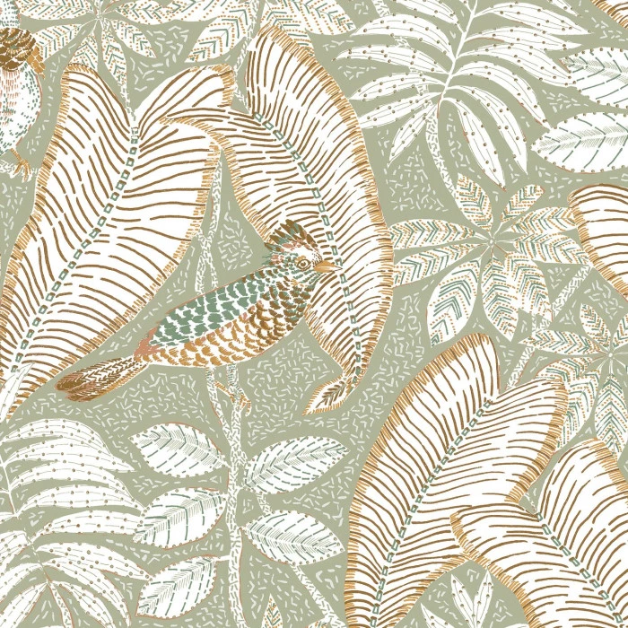 Okładzina ścienna Sibia z kolekcji Orphee marki Casamance w motyw egzotycznych ptaków siedzących na gałęziach to wszystko w towarzystwie wielkich liści palmowych. Sprawdzi się w nowoczesnych, eleganckich wnętrzach. Dostępna w 4 wersjach kolorystycznych. Niewielkie zabrudzenia, można wyczyścić wilgotną gąbką.