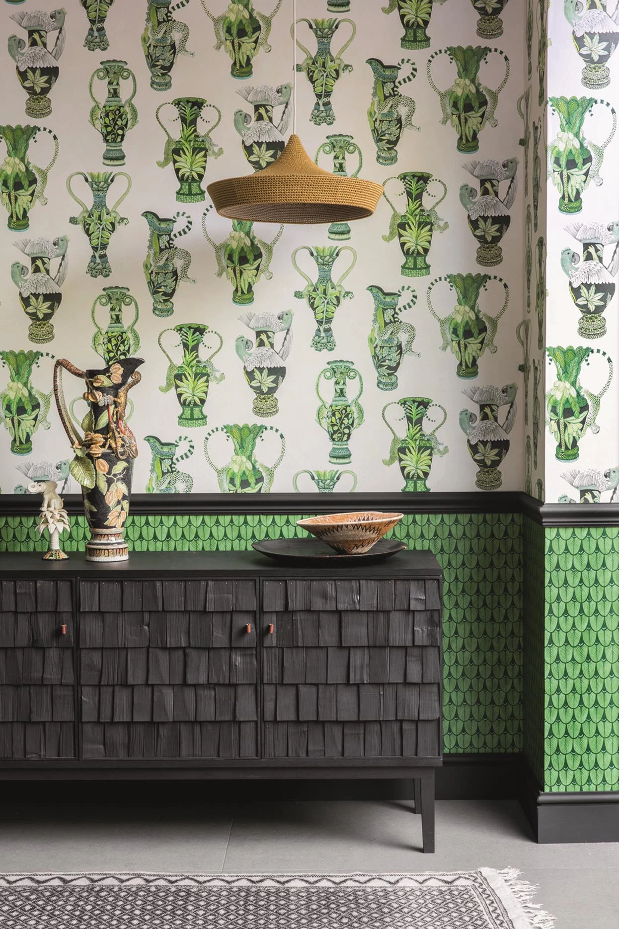 Tapeta Khulu Vases z kolekcji The Ardmore Collection marki Cole&Son przedstawia klasyczne wazy oplecione lampartami, papugami, lwami i innymi afrykańskimi zwierzętami. Okładzina sprawdzi się w salonie, jadalni lub przedpokoju. Do wyboru 4 warianty kolorystyczne.