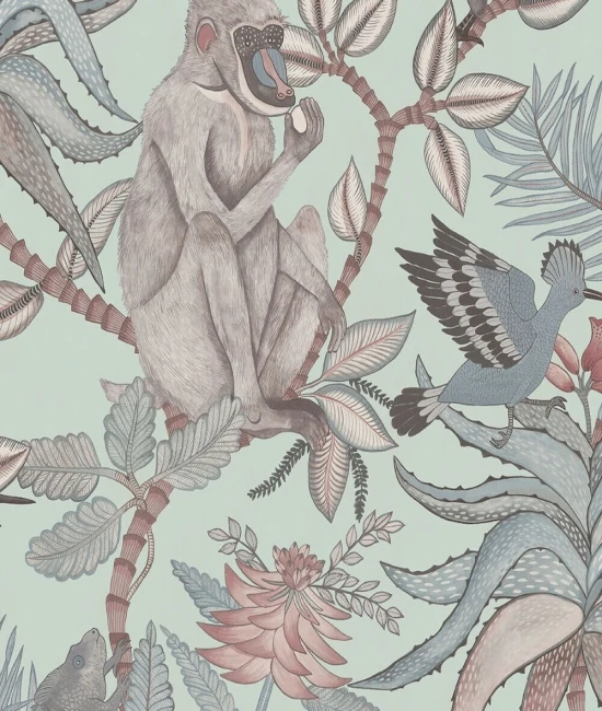 Tapeta Savuti z kolekcji The Ardmore Collection marki Cole&Son inspirowana afrykańskim parkiem narodowym. Przedstawia dudki,pawiany, kameleony na tle liści. Okładzina sprawdzi się w salonie, sypialni czy egzotycznym przedpokoju. Do wyboru 7 wariantów kolorystycznych.