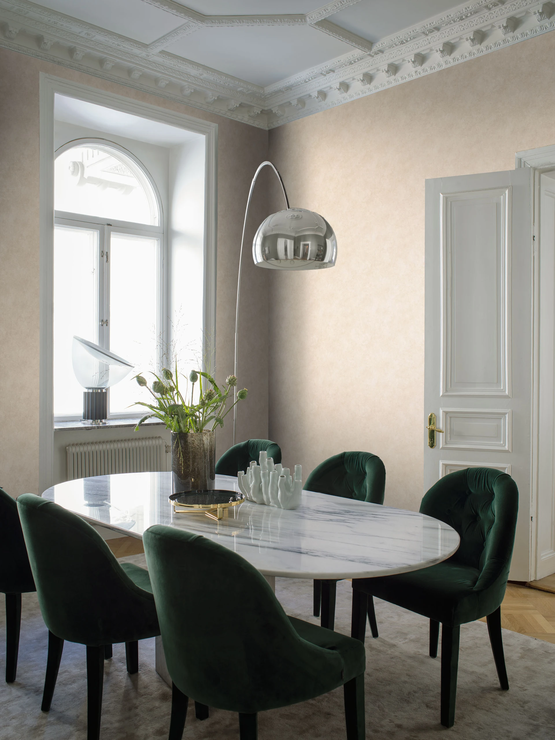 Royal z kolekcji Lounge Luxe to tapeta firmy Borastapeter czerpie inspirację z estetyki epoki art deco. Łączy ona różne tekstury i odcienie z wykończeniem w delikatnym połysku. Sprawdzi się najlepiej jako tło dla wnętrz urządzonych elegancko w stylu glamour czy art deco. Dostępna jest w pięciu wersjach kolorystycznych.