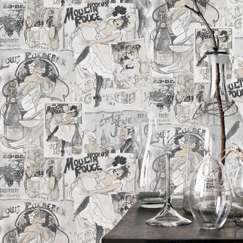 Tapeta z kolekcji Nostalgie marki Galerie przedstawia ciekawe rysunki, plakaty. Wzór sprawdzi się we wnętrzach w stylu retro. Do zamontowania w salonie, sypialni, przedpokoju, jadalni, kuchni lub restauracji. Dostępne są 4 kolory.
