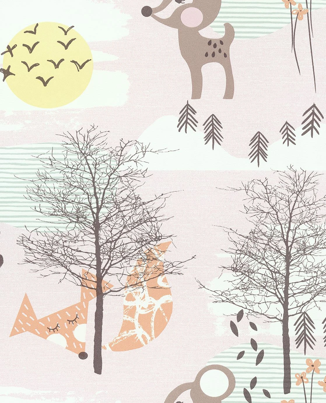 Tapeta Tout Petit od Eijffinger (354112,354111) to pastelowa okleina w leśnym klimacie. Jest matowa i posiada gładka powierzchnię. Najlepiej sprawdzi się we wnętrzach z drewnianymi meblami w stylu skandynawskim.