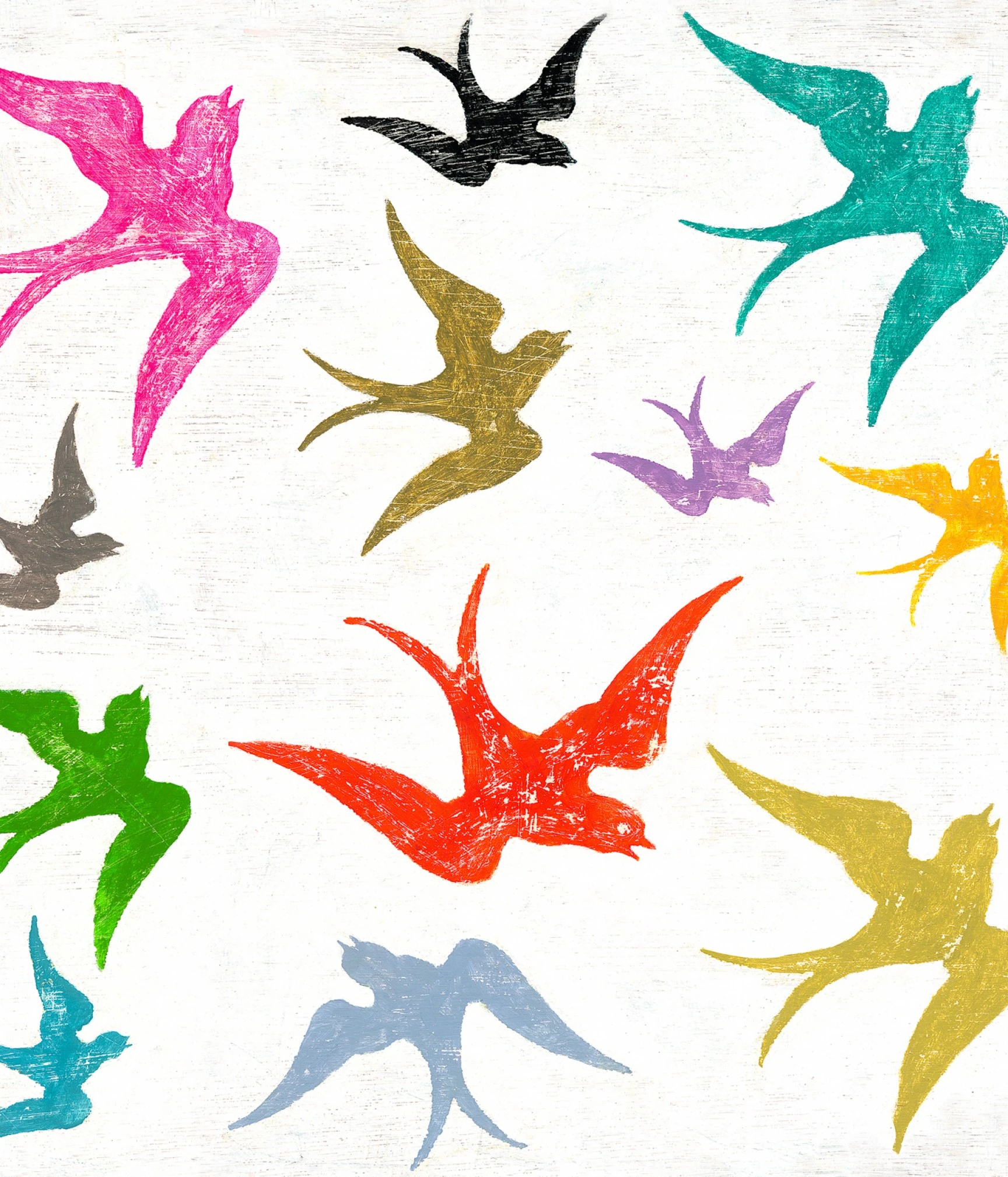 Tapeta Excuse Me While I Kiss The Sky z kolekcji The Sugarboo Collection marki Mind The Gap w kolorowe artystyczne ptaki. Sprawdzi się w sypialni, jadalni lub ciekawym przedpokoju. Projekt drukowany jest na 3 rolkach.
