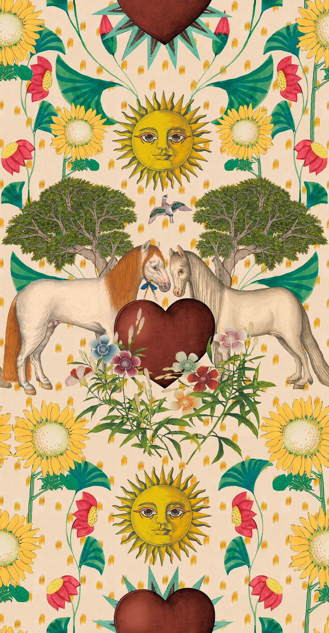 Wędruj przez złote pola słoneczników, podczas gdy dzikie konie pasą się w cieniu pobliskiego lasu. Symboliczne serca promieniują poczuciem komfortu i spokoju, gdy zatracasz się na kapryśnych łąkach, które otaczają cię spokojem. Słońce ogrzewa twoją skórę, gdy wsłuchujesz się w odgłosy przelatujących nad tobą ptaków. Przywołująca dźwięki i zapachy długich letnich popołudni, tapeta MIRAGE, osadzona na dwóch kontrastujących tłach, wprowadza do pomieszczenia kojący nastrój.