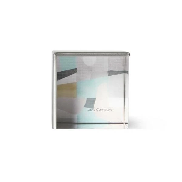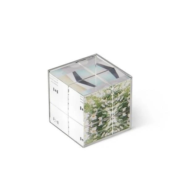 Trójwymiarowy szklany sześcian, który wsuwa się w szczotkowaną metalową ramę, aby zaprezentować trzy obrazy 2,5 x 2,5 cala
