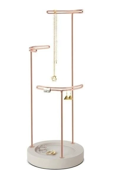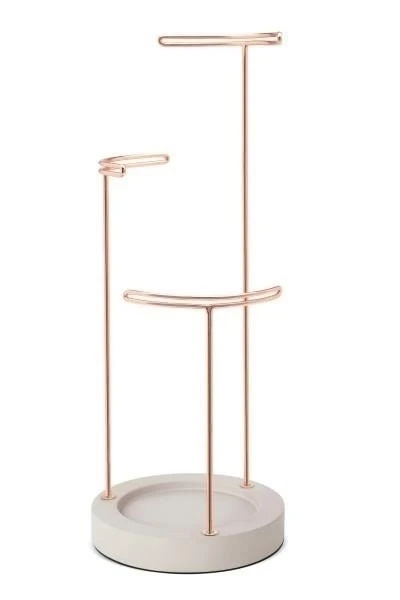 Elegancki i praktyczny stojak przeznaczony na biżuterię oraz inne dodatki. Składa się z trzech pręcików, na których możemy przechowywać biżuterię wiszącą jak i inne dodatki oraz okrągłej betonowej tacki służącej do przechowywania pierścionków lub kolczyków. Mamy tu do czynienia z idealnym połączeniem estetyki oraz funkcjonalności. Poza swoim podstawowym przeznaczeniem wieszak będzie ciekawym elementem dekoracyjnym garderoby lub sypialni.