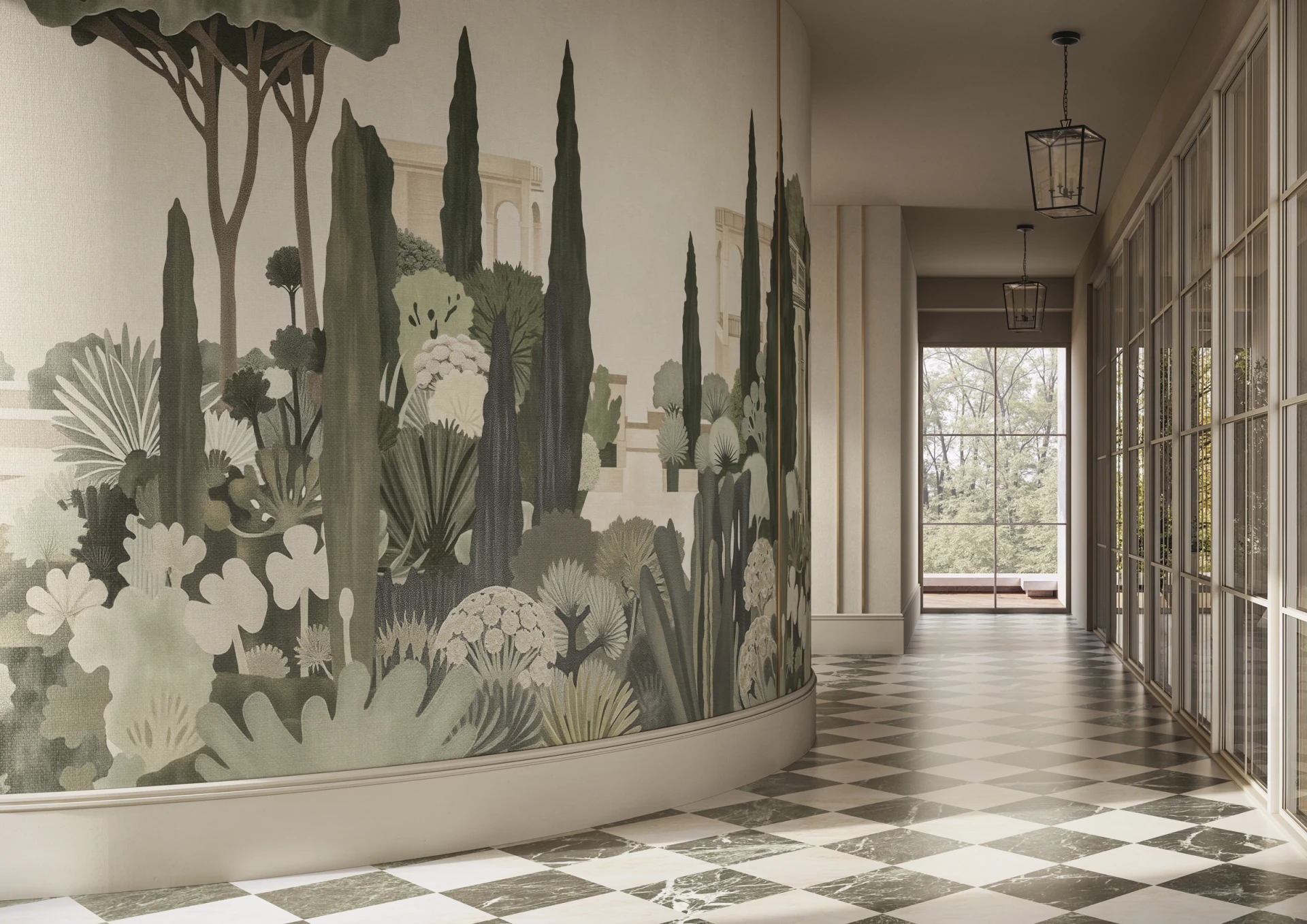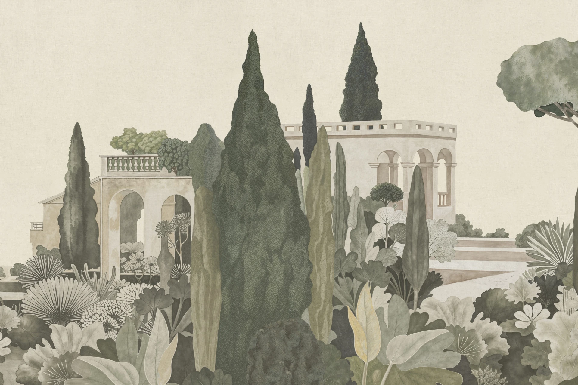 Grafika Glamora BELVEDERE to sceniczna, pejzażowa kompozycja, która przenosi na ścianę sugestię klasycznego ogrodu pełnego pergoli, cyprysów i agaw — przestrzeni otwartej, śródziemnomorskiej i wyciszonej, w której architektura z lekkimi arkadami spotyka się z miękkimi masami zieleni. Detaliczny rysunek roślinnych form i geometrycznych struktur splata się z delikatnymi płaszczyznami tła, tworząc narracyjną przestrzeń o głębi i rytmie, przywołującą widok na idealny, zawieszony w czasie teren. Grafika występuje w różnych wariantach kolorystycznych — od bardziej naturalnych, roślinnych tonów po stonowane, neutralne odcienie — oraz w wersjach uzupełniających tła, które umożliwiają swobodne komponowanie harmonijnych, wielkoformatowych aranżacji ściennych.