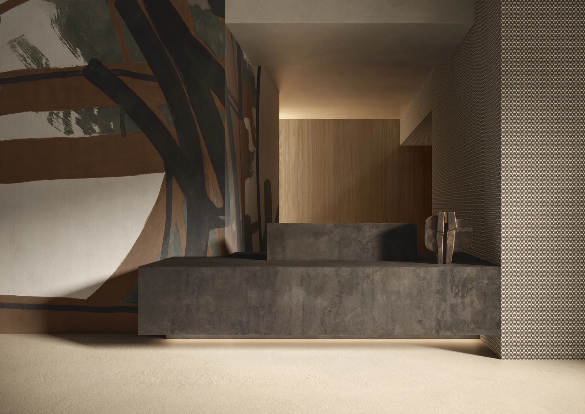 Grafika Glamora BISTRE to kompozycja, w której kaligraficzne ślady i energiczne gesty rysunku przepływają przez powierzchnię gęstą od warstw pigmentów i subtelnych znaków, tworząc dynamiczny dialog między żywymi, spontanicznymi akcentami a spokojniejszymi polami tła. Warstwowa struktura, osadzona w ziemistej, mineralnej palecie, sugeruje głębię, pamięć i subtelne przesunięcia form, budując rytm jednocześnie strukturalny i swobodny. Grafika występuje w wariantach kolorystycznych oraz w wersjach uzupełniających mikropatternów i neutralnych tłach, które pozwalają na harmonijne komponowanie wielkoformatowych aranżacji ściennych, zachowując ciągłość i spójność projektu ściany lub większej przestrzeni.