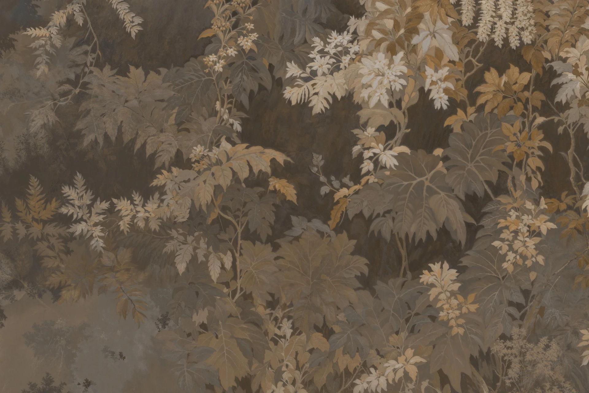 Grafika Glamora BOMARZO to bujna, sceniczna kompozycja inspirowana dziką, tajemniczą roślinnością – pnącza, paprocie i korony kwiatów wspinają się po głębokim, zaciemnionym tle niczym w ukrytym, starożytnym ogrodzie. Motyw łączy gęstą, teatralną roślinność z miękkimi przejściami światłocienia, tworząc wrażenie rytmu, głębi i subtelnej narracji przywołującej klimat legend i zapomnianych przestrzeni natury. Grafika występuje w wariantach kolorystycznych oraz w wersjach uzupełniających – abstrakcyjnych mikro-patternach i neutralnych tłach o drobnej fakturze – które umożliwiają swobodne komponowanie harmonijnych, wielkoformatowych aranżacji ściennych.