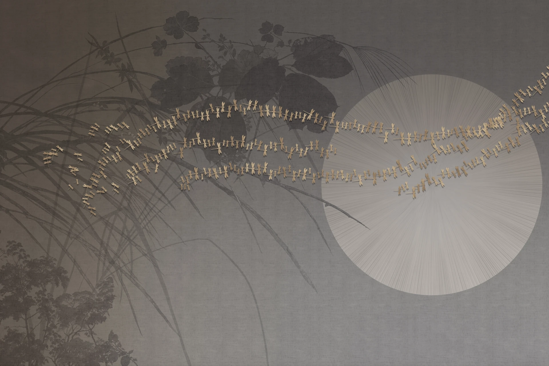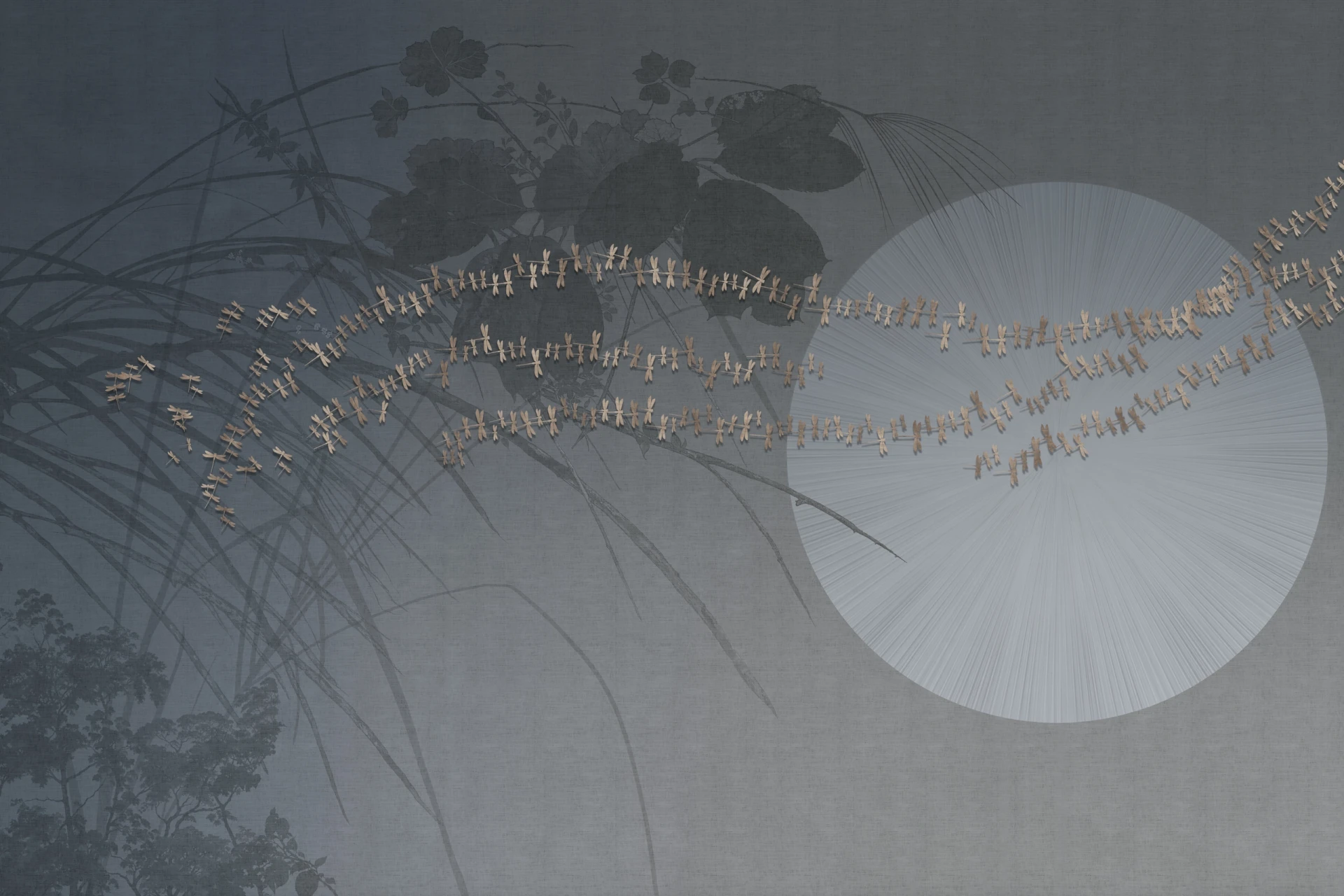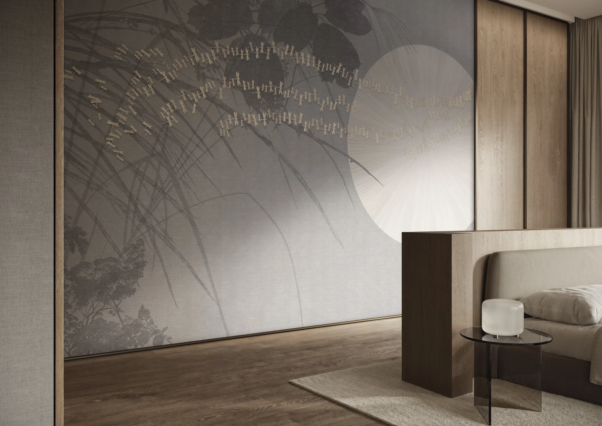 Grafika Glamora LEVANTE to kompozycja, w której między botanicznymi sylwetkami i długimi źdźbłami traw rozpościera się duży, astronomiczny dysk rozświetlający przestrzeń łagodnym blaskiem. Małe ważki tańczą wokół jego krawędzi, jakby były iskrami światła na tle miękko nakładanych warstw faktur i delikatnych przejść kolorów, tworząc wrażenie wewnętrznej świtu, który otwiera pejzaż i spowalnia jego czas. Grafika występuje w wariantach kolorystycznych oraz w wersjach uzupełniających — abstrakcyjnych mikro-patternach i neutralnych tłach o subtelnej teksturze — które umożliwiają komponowanie harmonijnych, wielkoformatowych aranżacji ściennych.