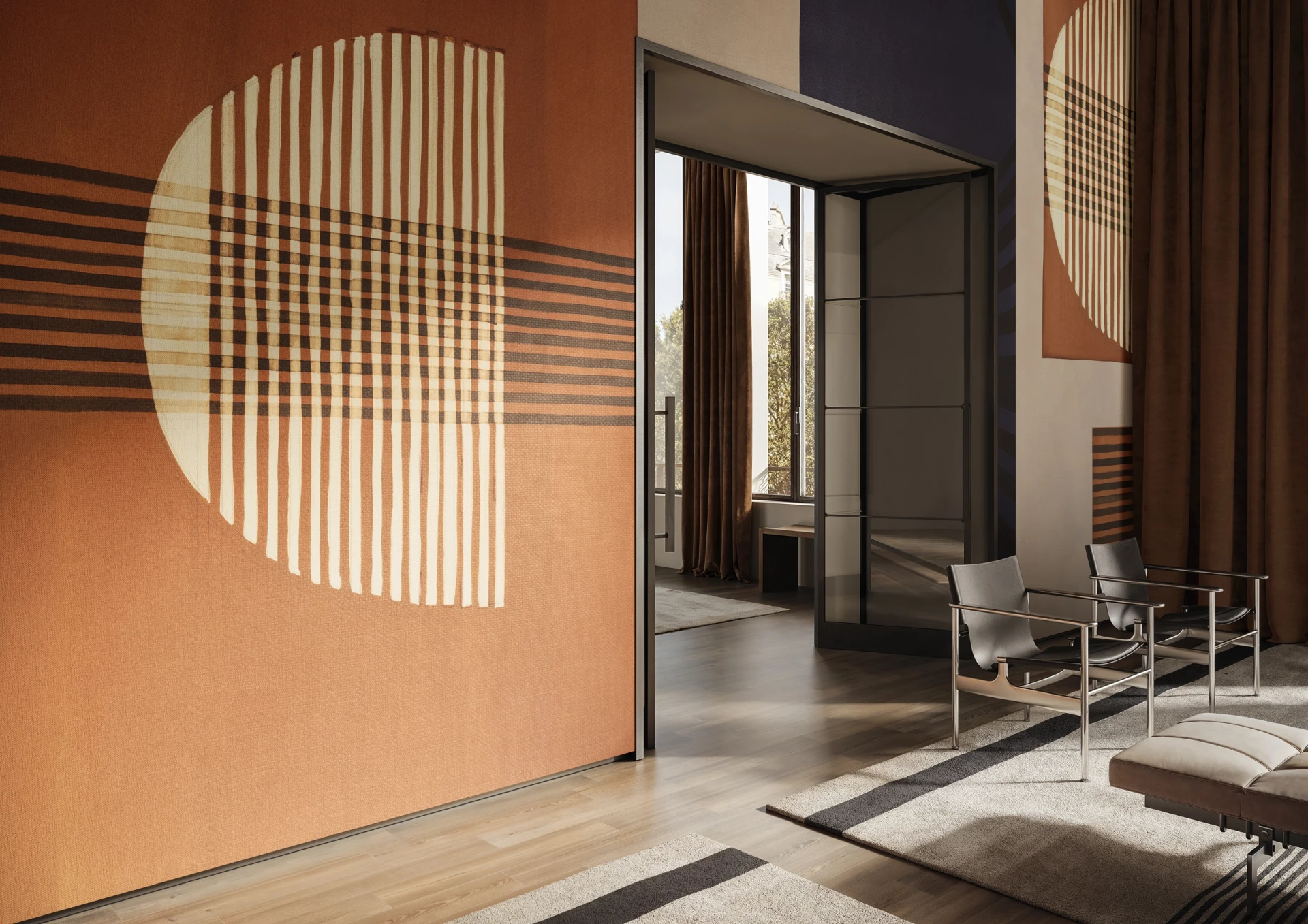 Grafika Glamora TERRACINA to abstrakcyjna kompozycja budowana wokół spotkania półokręgu przełamanego rytmicznymi liniami oraz zwartymi pasmami przecinanymi horyzontalnymi śladami, które prowadzą się jak fale dźwiękowe, rozprzestrzeniając i skupiając rytm formy. Pełne pola zestawione z liniowymi akcentami definiują intensywną, kierunkową ikonografię o zdecydowanym charakterze, w której geometria i rytm tworzą współczesny totem obecności scenicznej. Grafika występuje w wariantach kolorystycznych oraz w wersjach uzupełniających — abstrakcyjnych mikro-patternach i neutralnych tłach o subtelnej fakturze — które umożliwiają komponowanie spójnych, wielkoformatowych aranżacji ściennych.
