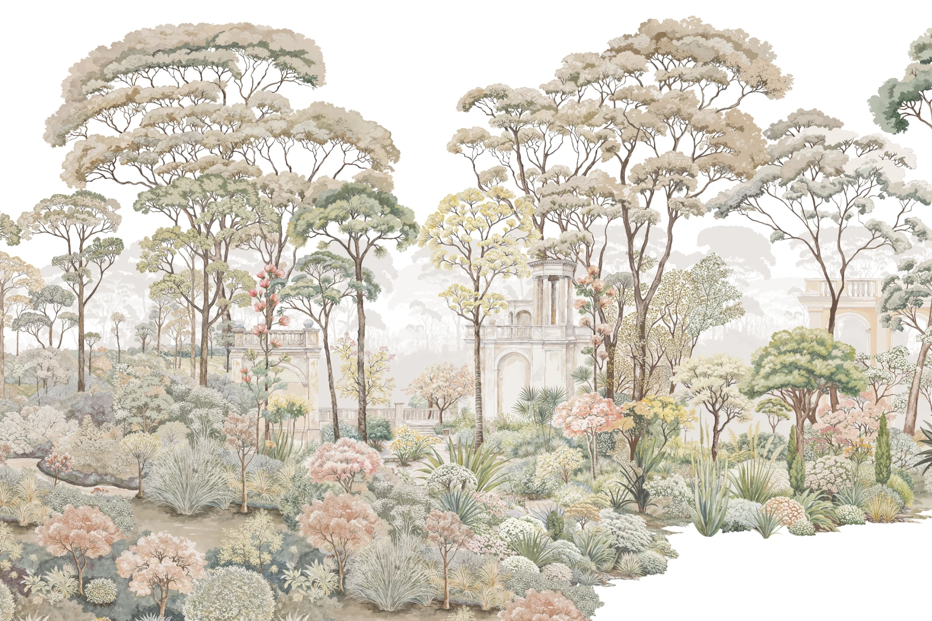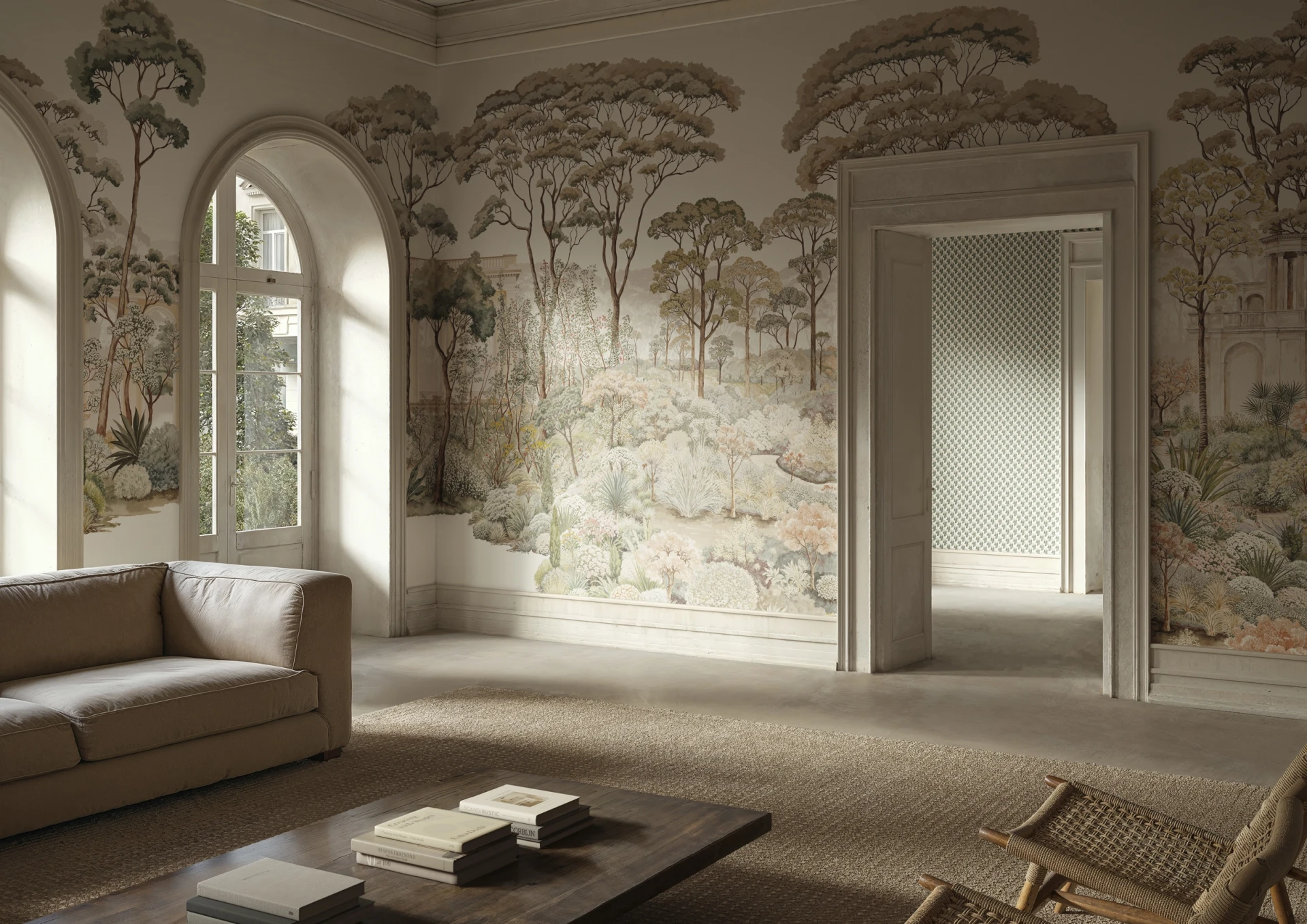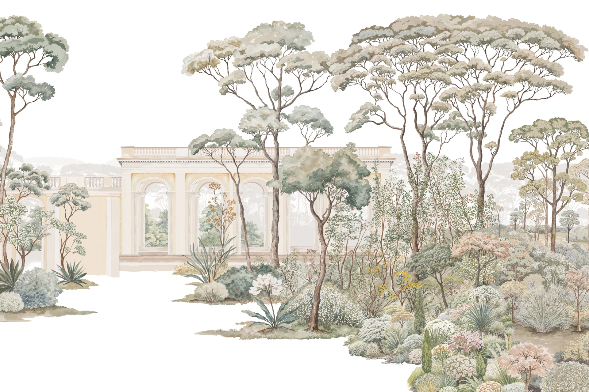 Grafika Glamora VILLA PAMPHILI to kompozycja inspirowana widokiem świetlistej fasady z arkadami i balustradami, która stanowi tło dla delikatnej roślinnej sceny z sosnami, agawami i kwitnącymi krzewami, jakby zaaranżowanymi przez niewidzialnego ogrodnika. Roślinne elementy układają się rytmicznie w przestrzeni, tworząc scenę przypominającą swobodny, miejski spacer w ogrodzie pełnym filtrującego się światła. Grafika występuje w wariantach kolorystycznych oraz w wersjach uzupełniających — mikro-patternach i neutralnych tłach o subtelnej fakturze — które umożliwiają komponowanie spójnych, wielkoformatowych aranżacji ściennych.