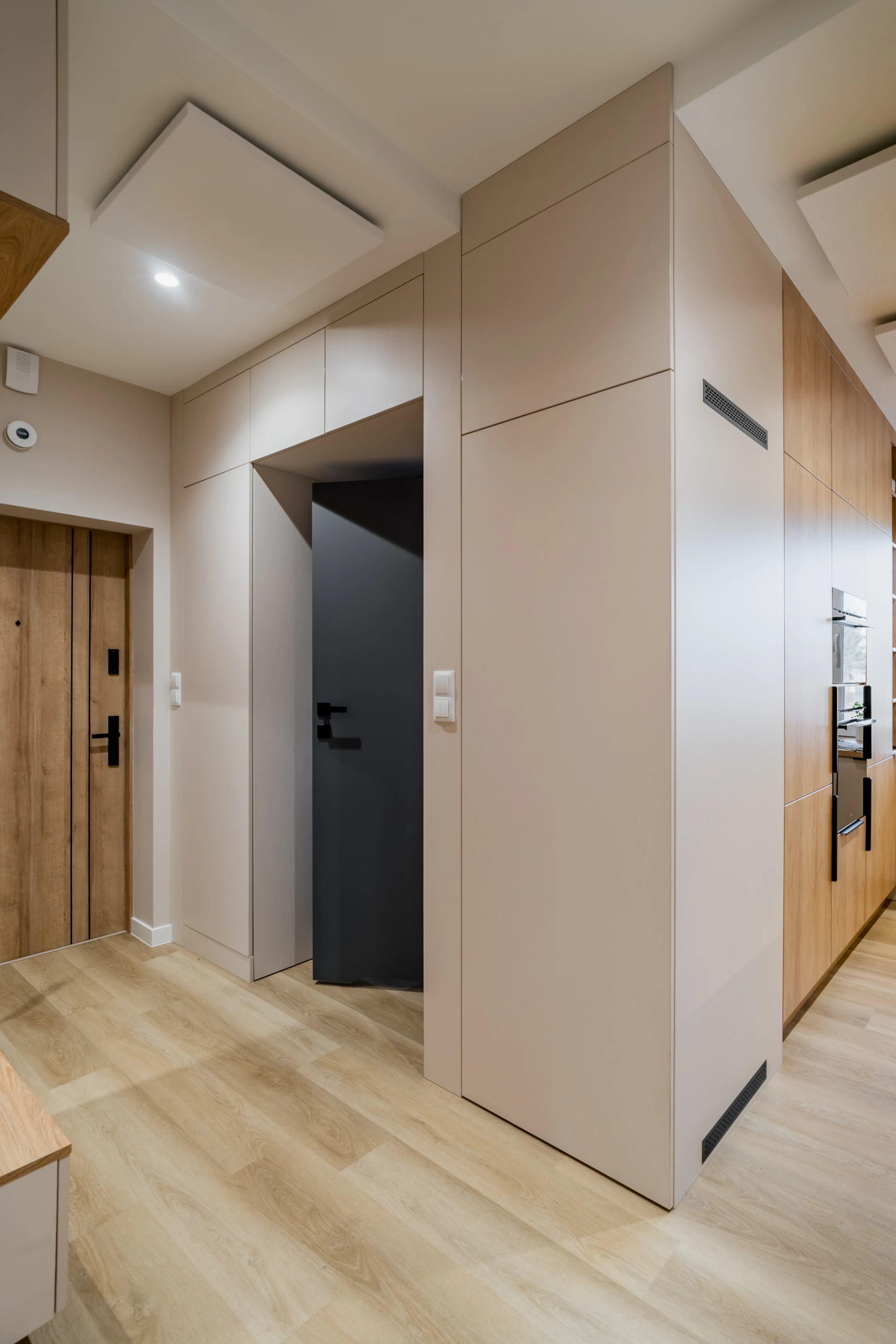 Już w strefie wejścia widać zamiłowanie do czystych form. Drewniane lamele, siedzisko i lustro tworzą funkcjonalny moduł powitalny, a pojemne zabudowy pozwalają ukryć to, co nie musi być widoczne.