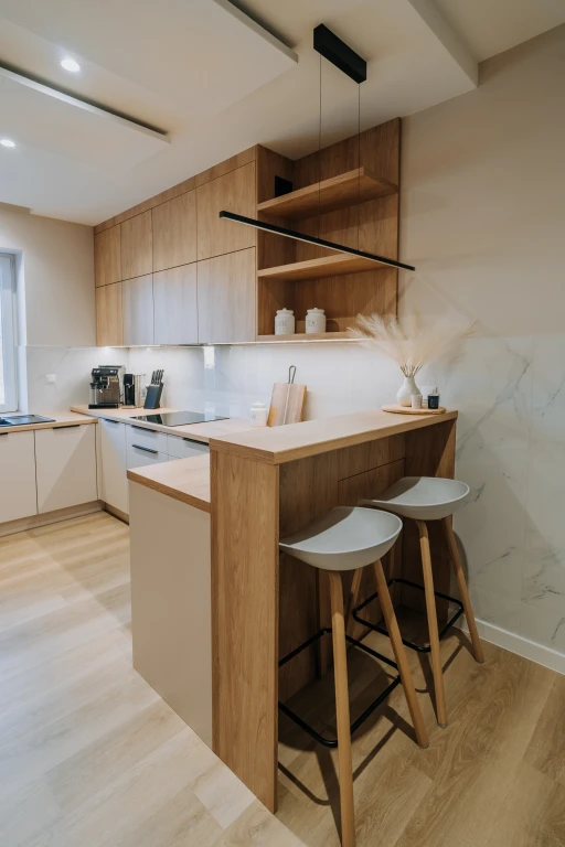 Zabudowy prowadzone są tu dwutorowo: jasne, gładkie fronty dolne oraz ciepłe, drewniane powierzchnie wysokich szaf. Kontrast jest czytelny, ale miękki.