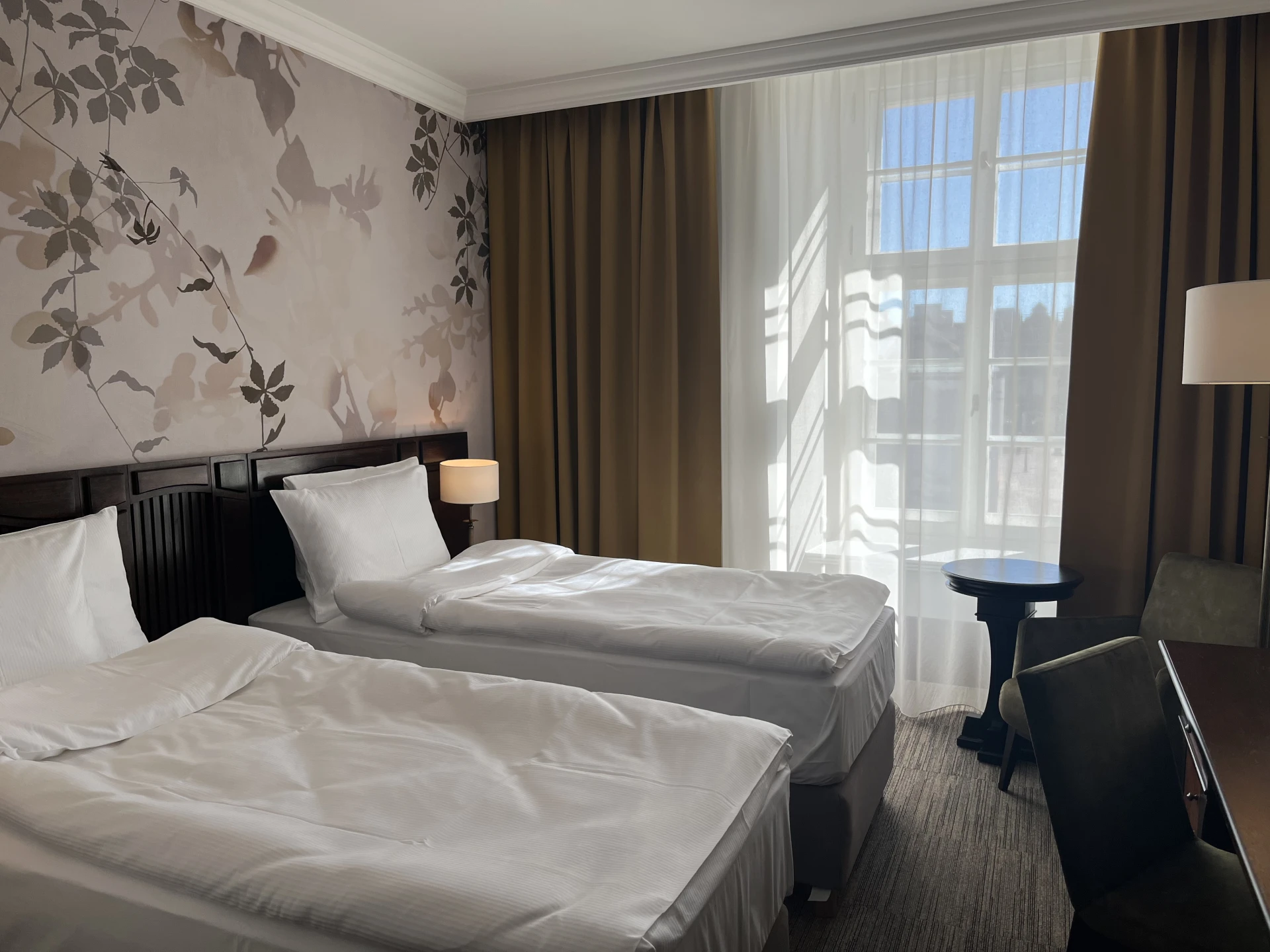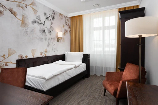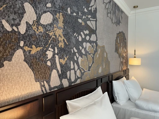 W jednym z pokoi uwagę przyciąga subtelny, roślinny rysunek tapety Arte 81535. Delikatna struktura liści, utrzymana w spokojnej, przygaszonej kolorystyce, tworzy tło, które nie dominuje wnętrza, ale je porządkuje. W połączeniu z ciemnym drewnem mebli i miękkim światłem lamp daje poczucie wyciszenia — dokładnie tego, czego oczekuje się od hotelowego pokoju w sercu miasta.