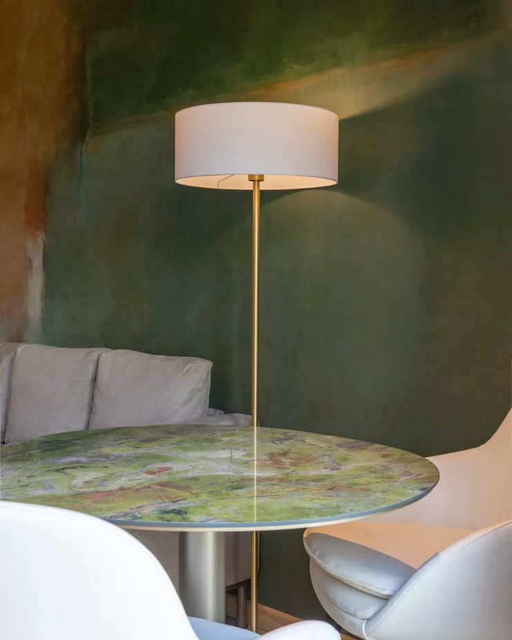 W pokojach szczególnie wyróżnia się tapeta Indigo; dzięki swoim błękitnym tonom przywodzi na myśl refleksy Jeziora Garda i towarzyszy gościom w zanurzeniu się w kojącej, jeziornej atmosferze. Paleta kolorów współgra z wyposażeniem i materiałami o miękkim, świetlistym charakterze, kształtując przestrzenie, które odzwierciedlają spokój otaczających wód.