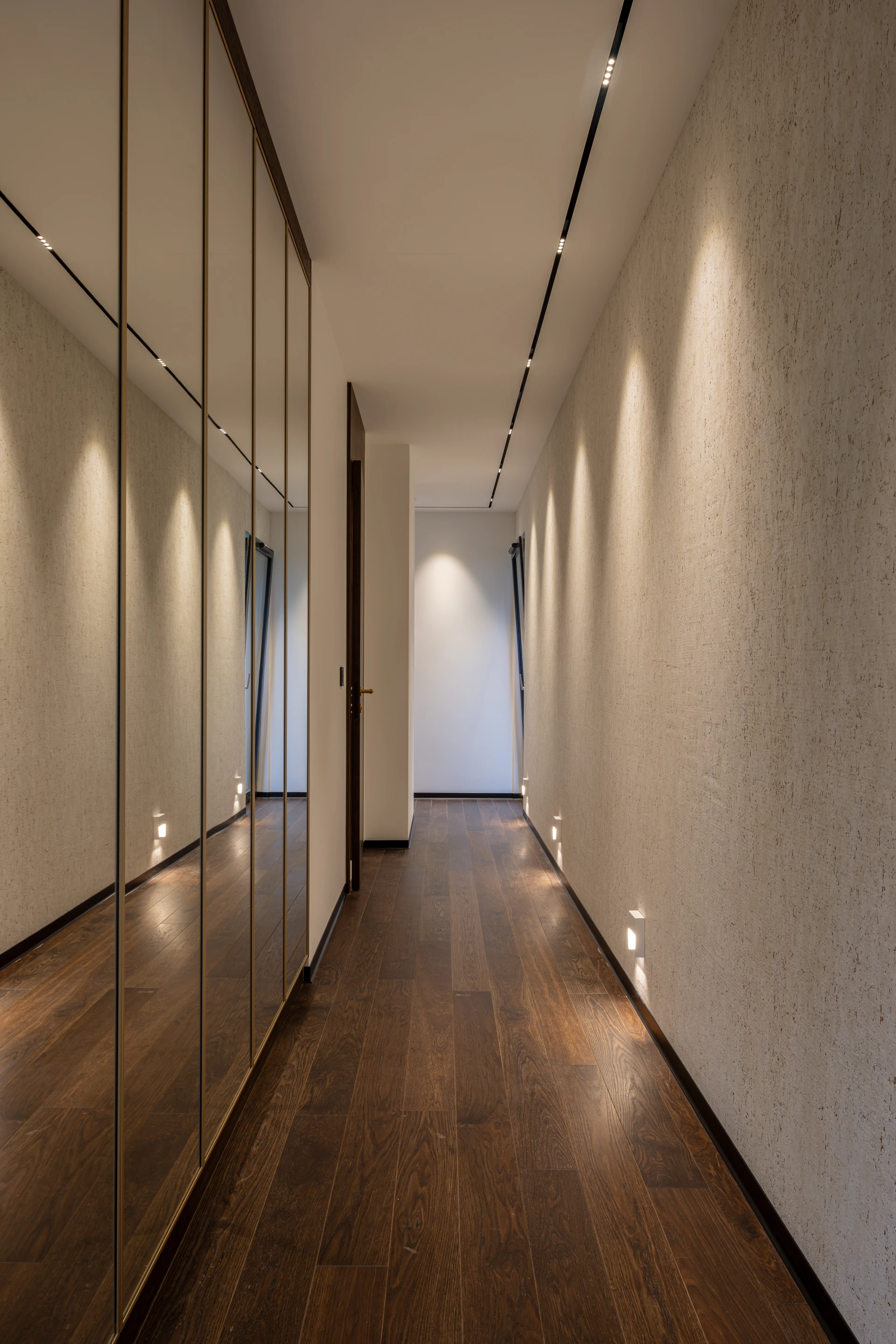 W korytarzu wzrok przyciąga biało-złota tapeta OMEXCO Khatam (również z Dekorian Home), która tworzy eleganckie tło dla lustrzanych tafli, oświetlenia liniowego i minimalistycznych drzwi. To detal, który łączy części prywatne i dzienne apartamentu w spójną całość.